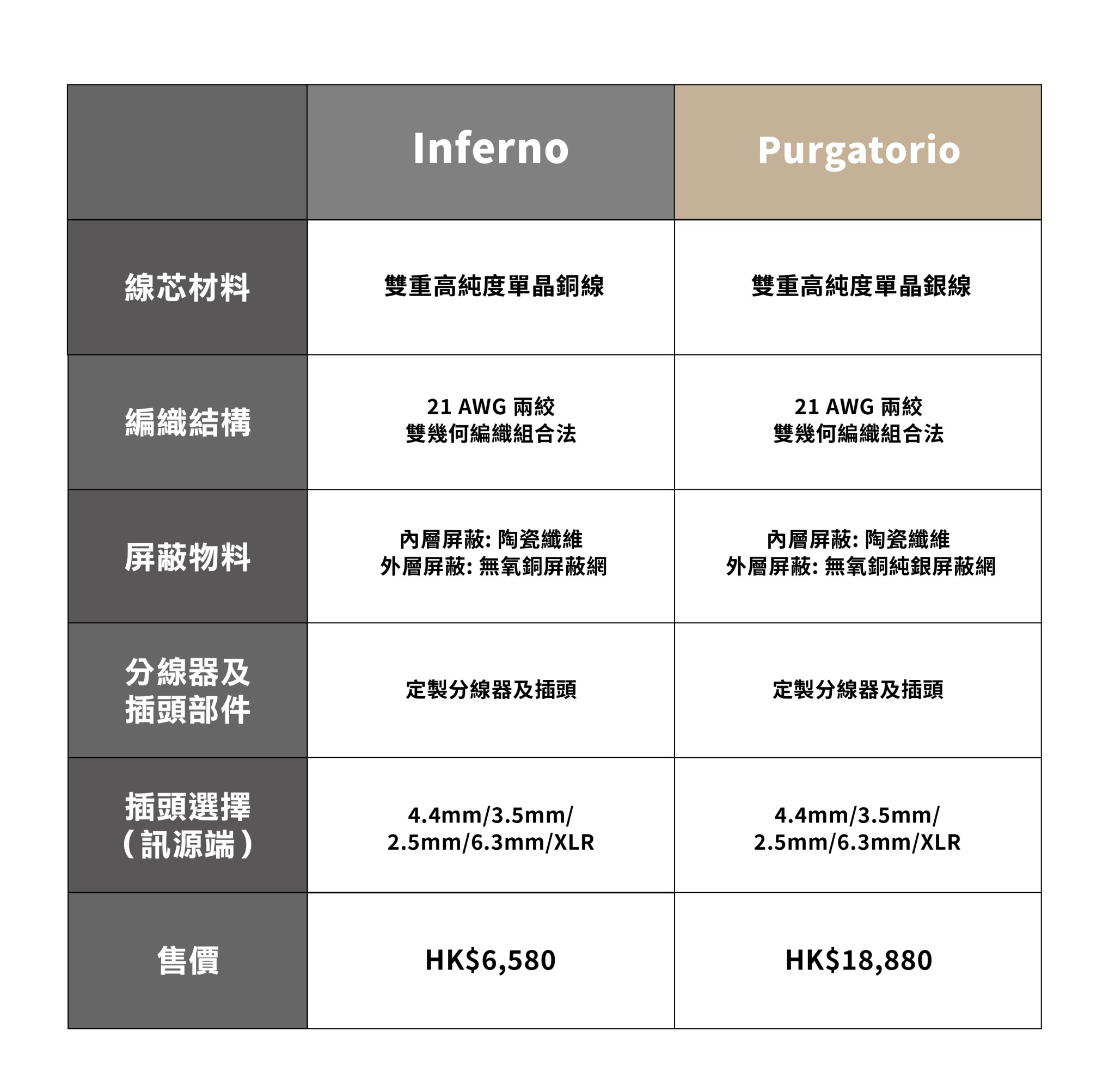 Purgatorio同樣採用了雙線股設計,選用更高效能的21AWG高純度純銀線傳遞,在外層加上EMF絕緣的OFC純銀屏蔽網,在內層則加上一個纖維陶瓷屏蔽層,有效阻隔電磁波干擾,兼顧不同頻段的音質表現,達到均衡的聲音。