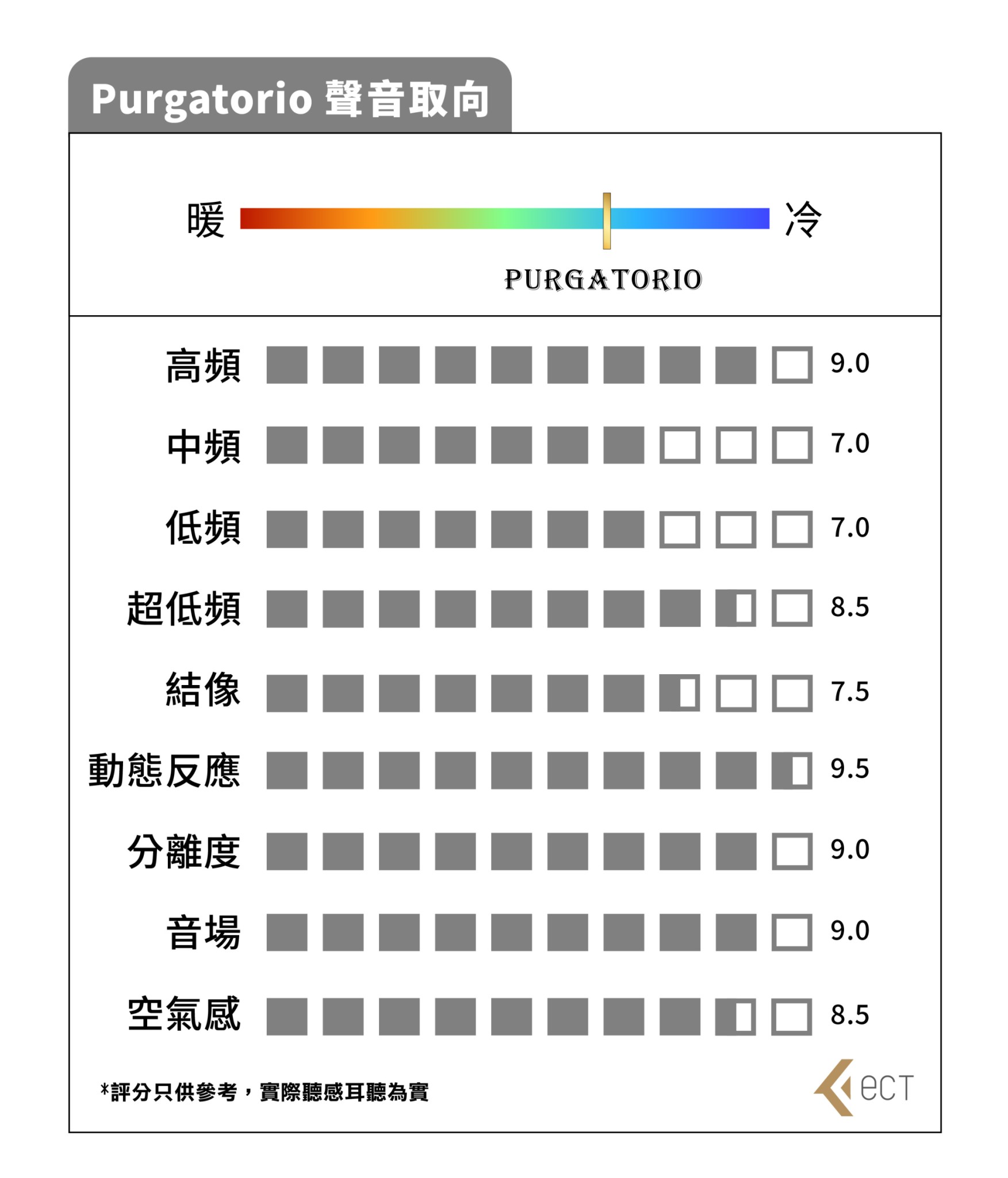 Purgatorio則有著爽快、通透的高頻延伸和速度感的聽感,同時更能較出人聲和樂器的聲音密度以及更清晰的聲音定位。