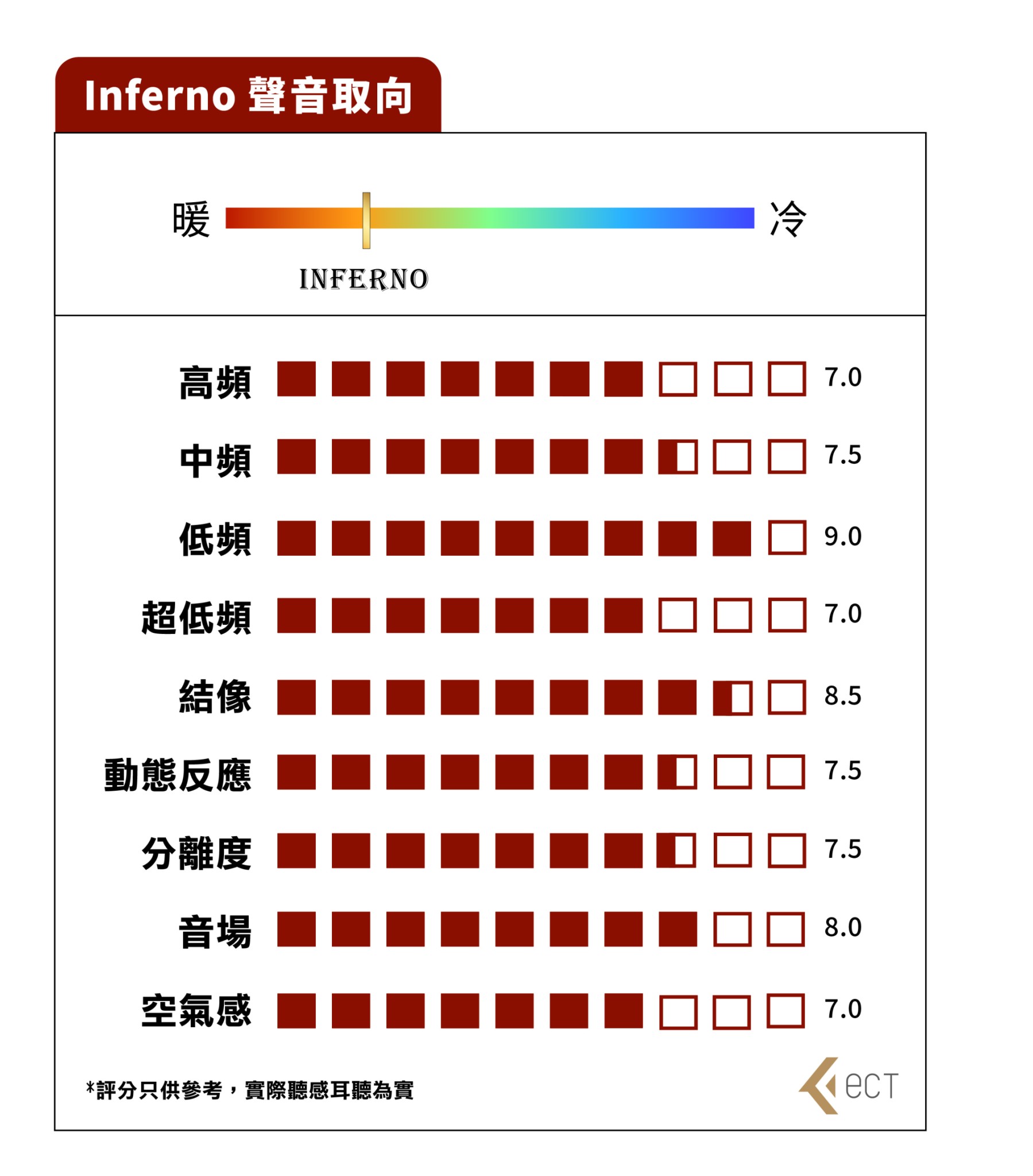 Inferno的音色偏重加強於低頻質量以及氛圍感,整體帶來更溫暖濃郁的音樂感。