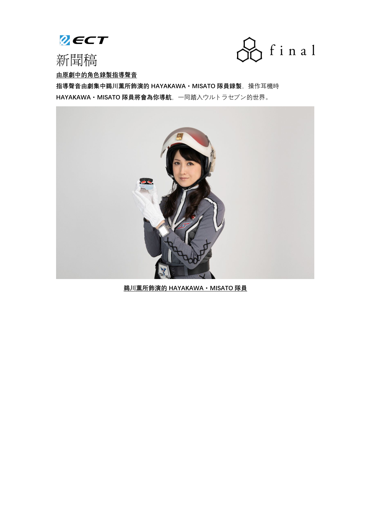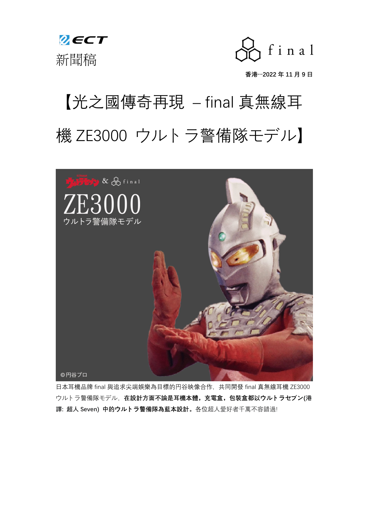 日本耳機品牌 final 與追求尖端娛樂為目標的円谷映像合作,共同開發 final 真無線耳機 ZE3000ウルトラ警備隊モデル,在設計方面不論是耳機本體,充電盒,包裝盒都以ウルトラセブン(港譯: 超人 Seven) 中的ウルトラ警備隊為藍本設計。各位超人愛好者千萬不容錯過!