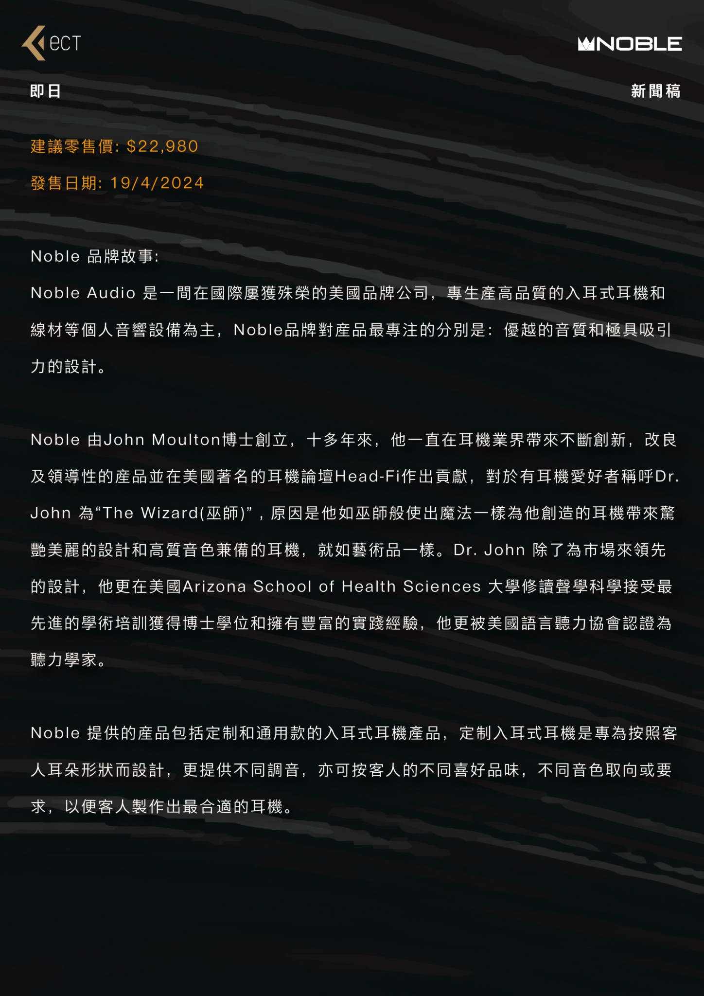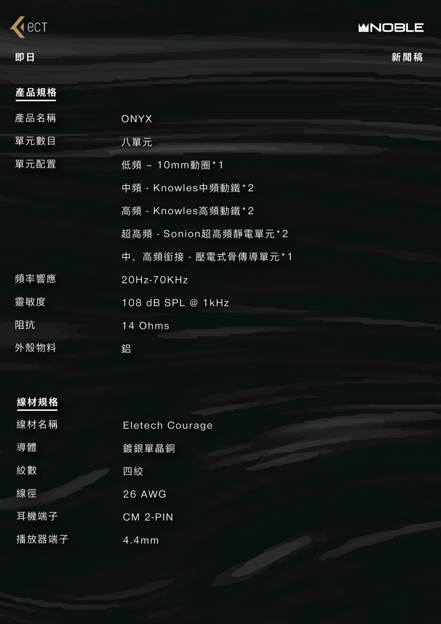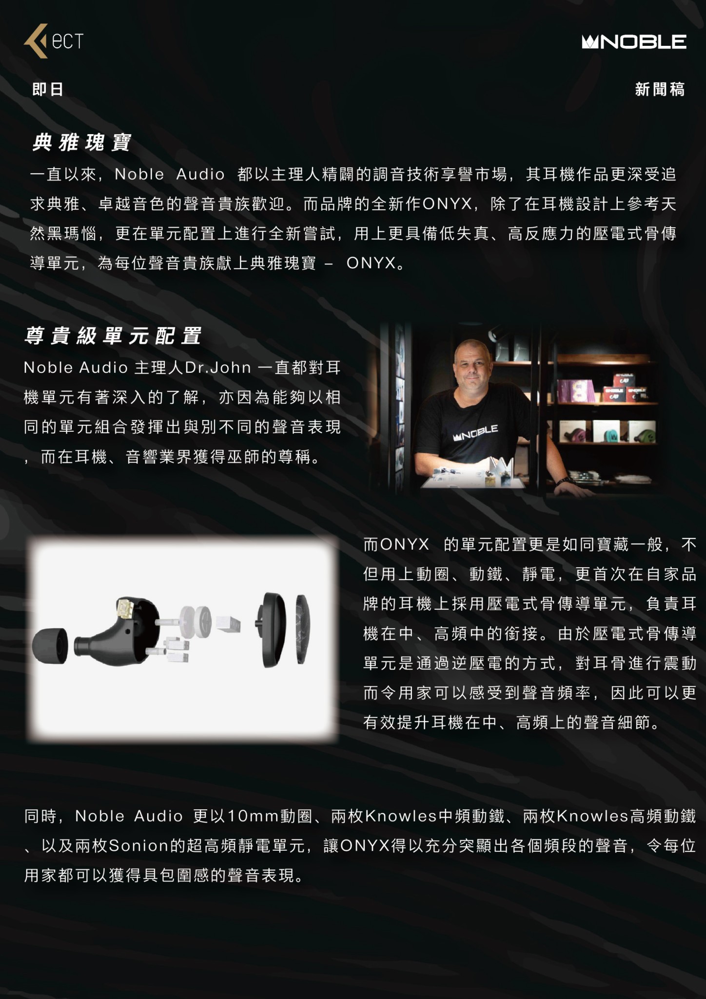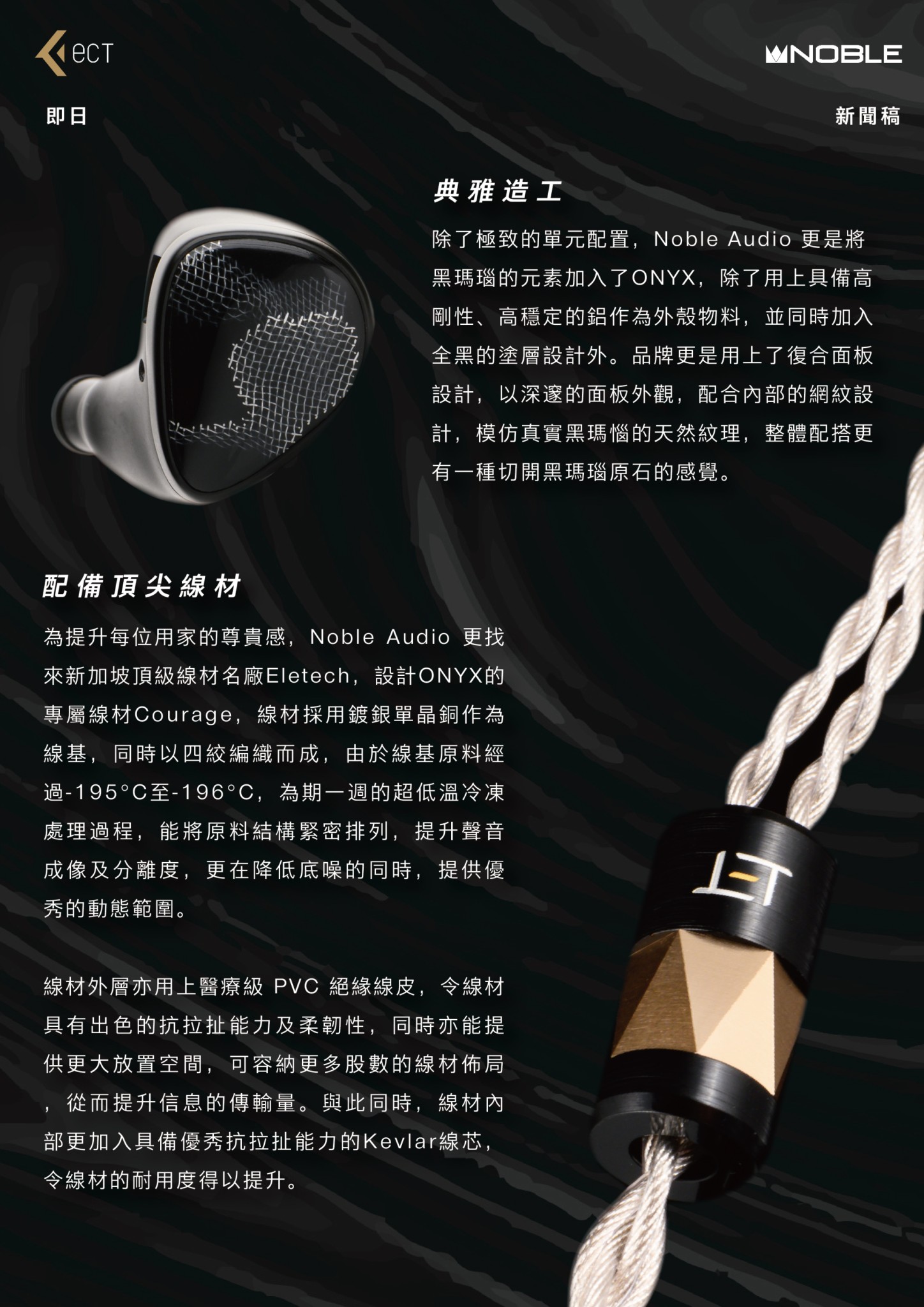 一直以來,Noble Audio 都以主理人精闢的調音技術享譽市場,其耳機作品更深受追求典雅、卓越音色的聲音貴族歡迎。而品牌的全新作ONYX,除了在耳機設計上參考天然黑瑪惱,更在單元配置上進行全新嘗試,用上更具備低失真、高反應力的壓電式骨傳導單元,為每位聲音貴族獻上典雅瑰寶 – ONYX。