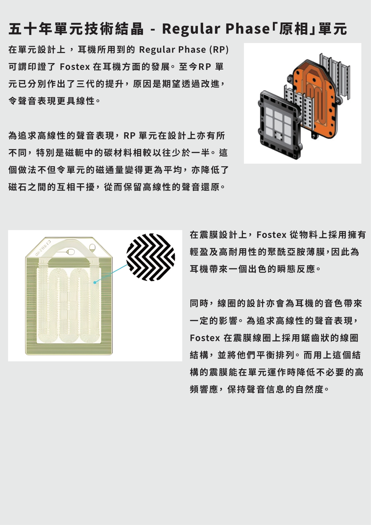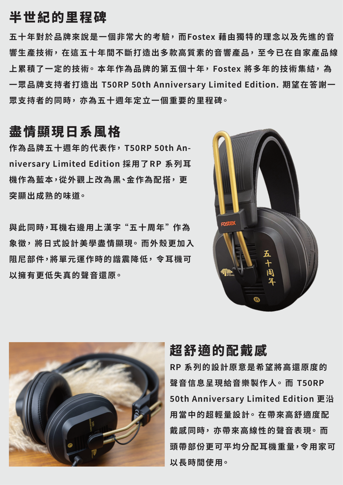 五十年對於品牌來說是一個非常大的考驗,而Fostex 藉由獨特的理念以及先進的音 響生產技術,在這五十年間不斷打造出多款高質素的音響產品,至今已在自家產品線 上累積了一定的技術。本年作為品牌的第五個十年,Fostex將多年的技術集結,為 一眾品牌支持者打造出 T50RP 50th Anniversary Limited Edition. 期望在答謝一 眾支持者的同時,亦為五十週年定立一個重要的里程碑。