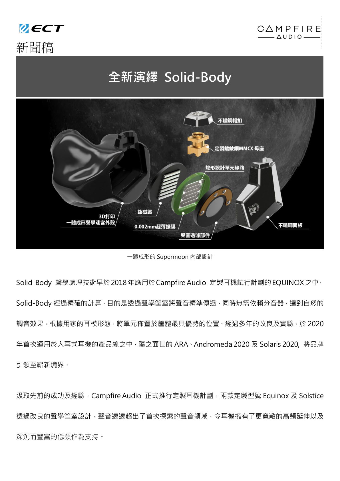 美國 Campfire Audio 旗下定製耳機型號再添一名猛將 — Supermoon. 首次使用 14mm 定製平板單元,以不鏽鋼飾板完美保護,內部利用廠方標誌性的 Solid-Body 設計,配合用家耳模形態,以先進 3D打印的聲學迷宮一體成形,將聲音質素再度昇華,編寫 Campfire Audio 的嶄新篇章。