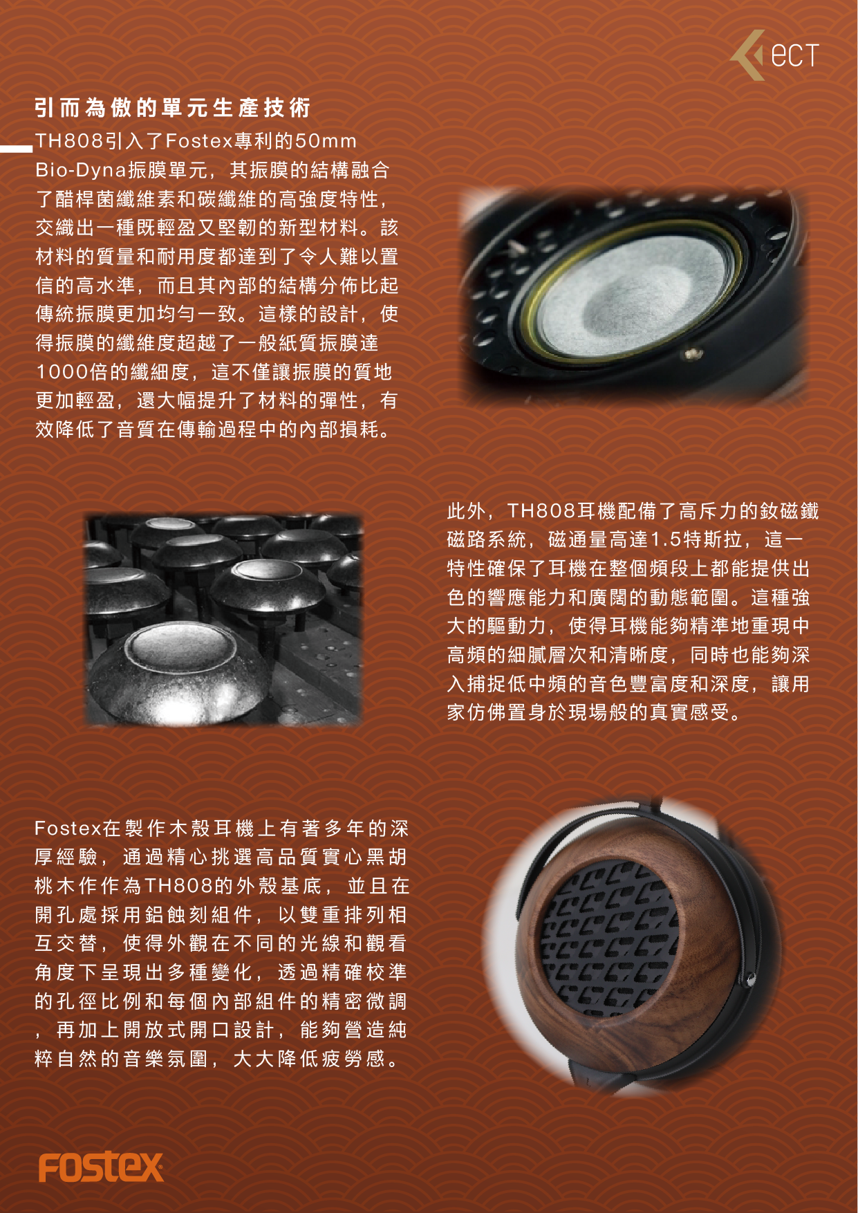 TH808在技術層面上承襲了Fostex頂級耳機型號TH909的卓越基因,不僅採用專利的Bio-Dyna振膜單元技術,更是精選了更具穩定性的優質黑胡桃木作為外殼材料,並且在開孔處採用鋁蝕刻組件,每個孔徑比例以及部件都經過精準的校準微調,比起一般開放式耳機擁有更自然和立體的共嗚空間。這些細節的精心組合,展現了Fostex在先進單元生產工藝方面的自豪與堅持,同時呈現出一種獨特的日式木藝美學,同時為用戶帶來一場自然且精確無比的聽覺盛宴。
