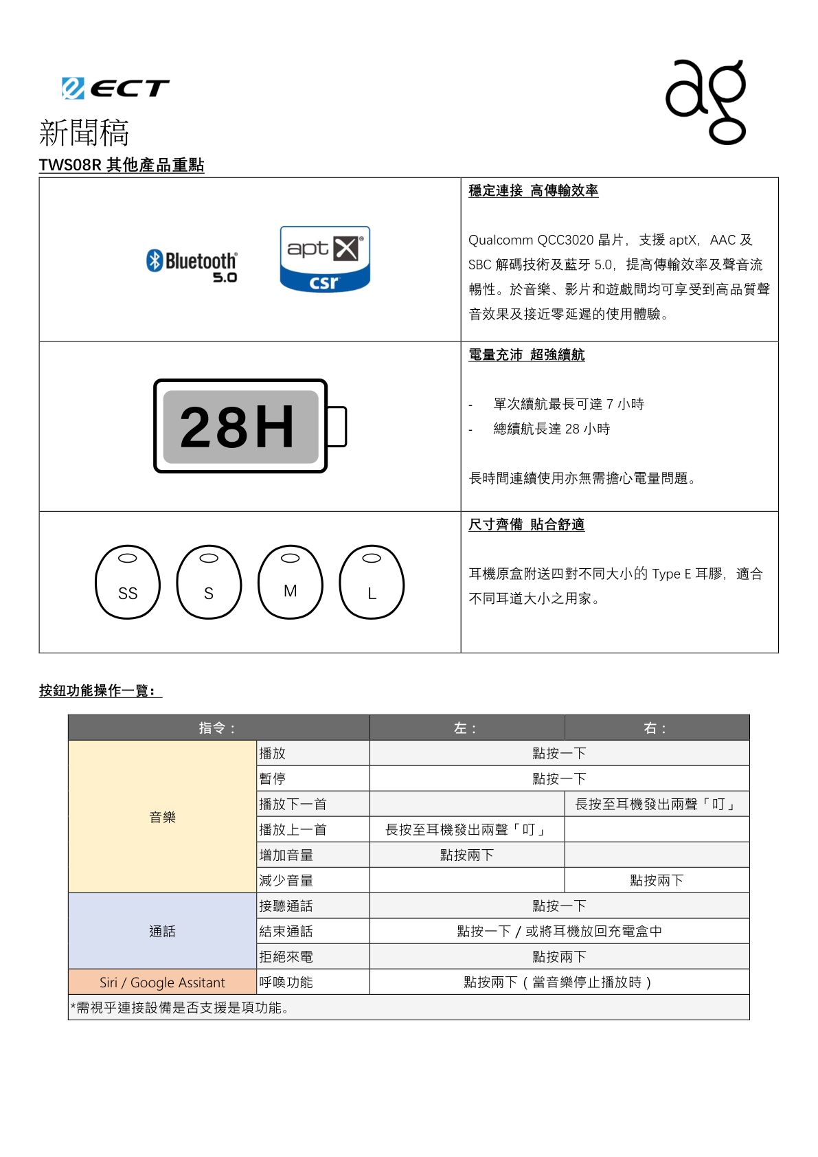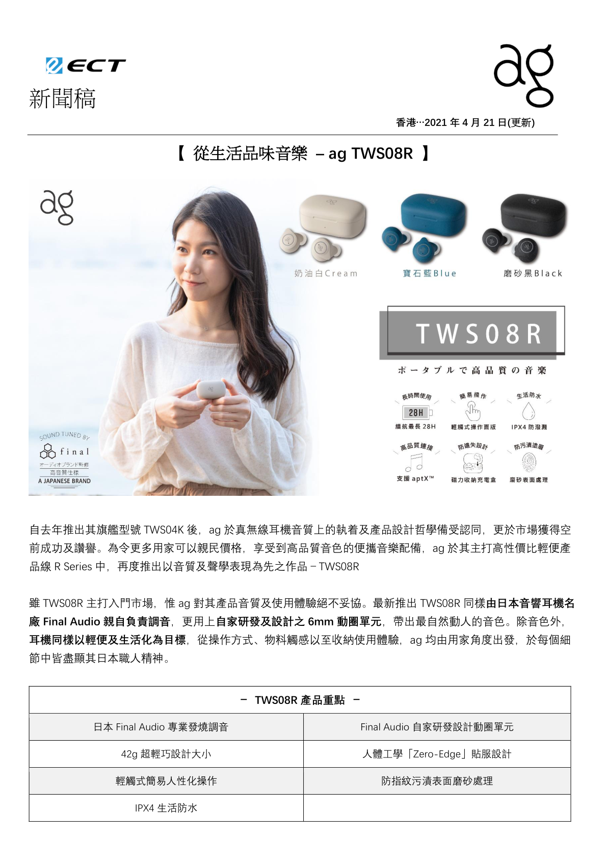 自去年推出其旗艦型號 TWS04K 後,ag 於真無線耳機音質上的執着及產品設計哲學備受認同,更於市場獲得空前成功及讚譽。為令更多用家可以親民價格,享受到高品質音色的便攜音樂配備,ag 於其主打高性價比輕便產品線 R Series 中,再度推出以音質及聲學表現為先之作品-TWS08R