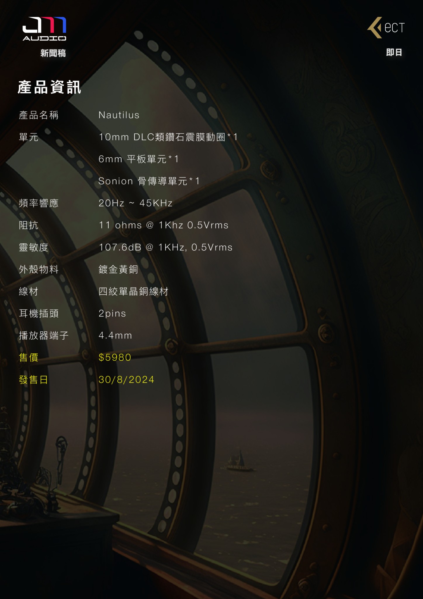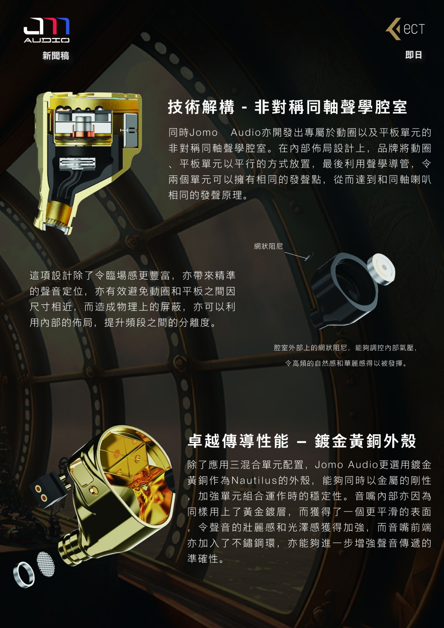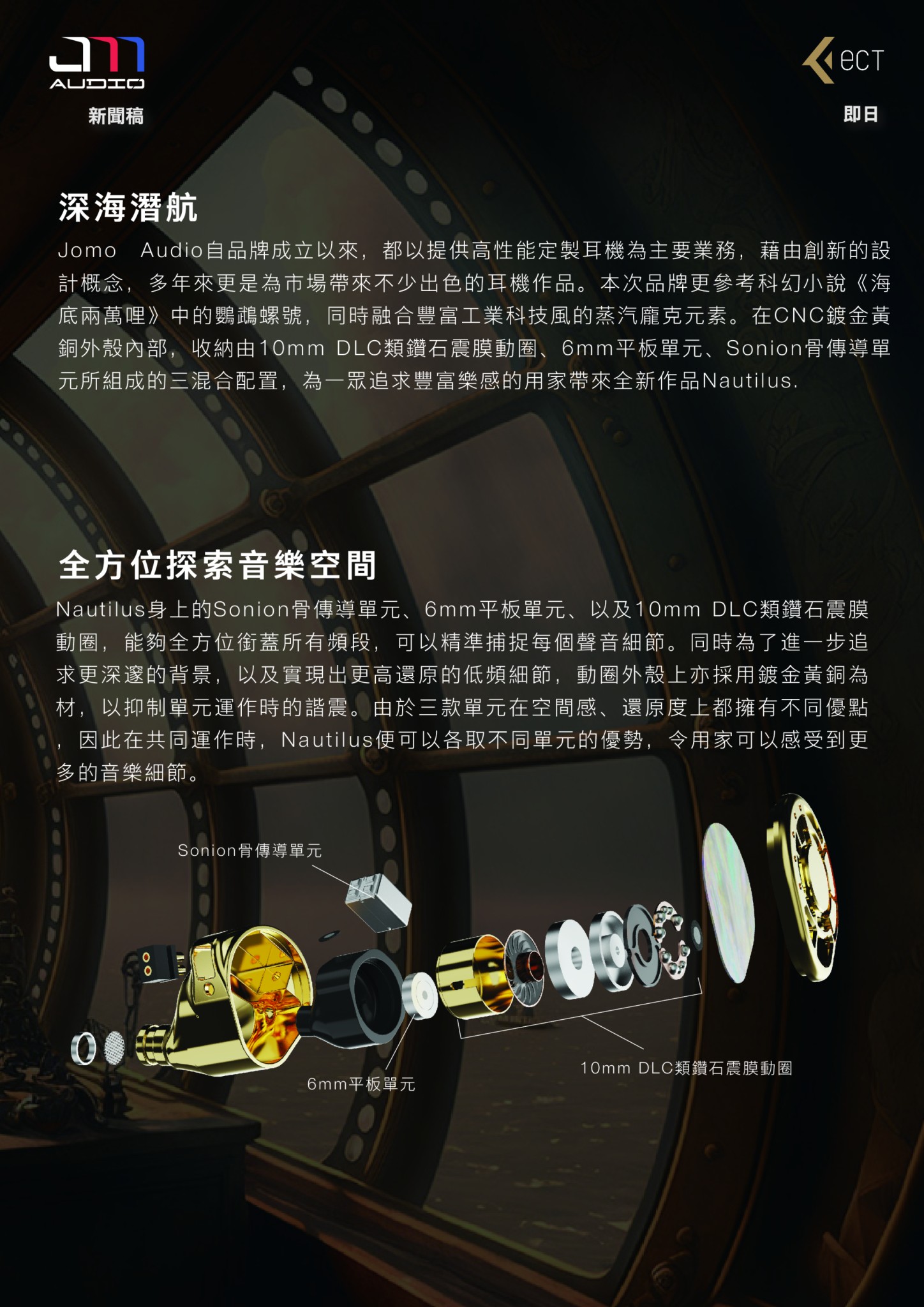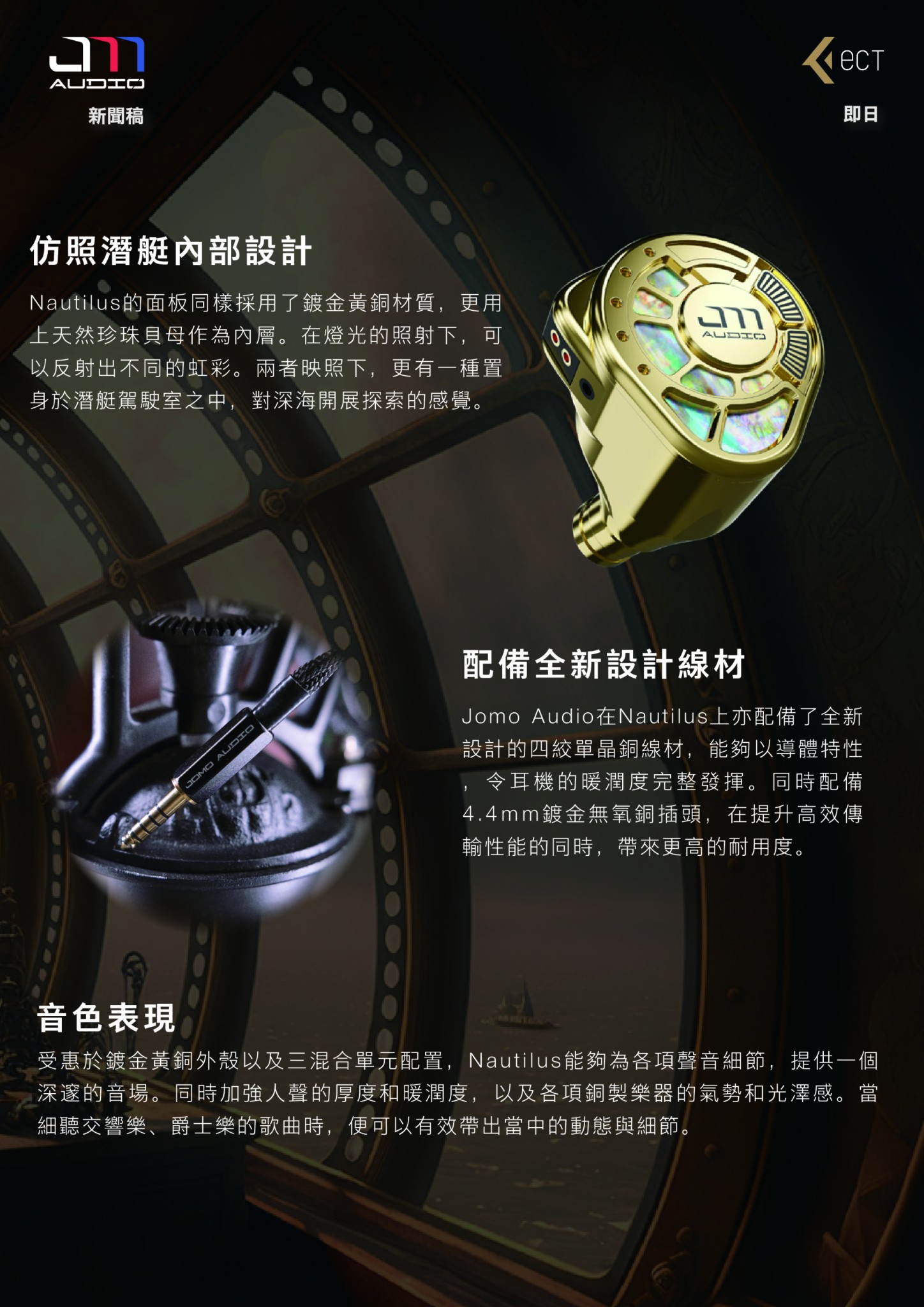Jomo Audio自品牌成立以來,都以提供高性能定製耳機為主要業務,藉由創新的設計概念,多年來更是為市場帶來不少出色的耳機作品。本次品牌更參考科幻小說《海底兩萬哩》中的鸚鵡螺號,同時融合豐富工業科技風的蒸汽龐克元素。在CNC鍍金黃銅外殼內部,採用由10mm DLC類鑽石震膜動圈、6mm平板單元、Sonion骨傳導單元所組成的三混合配置,為一眾追求豐富樂感的用家帶來全新作品Nautilus.