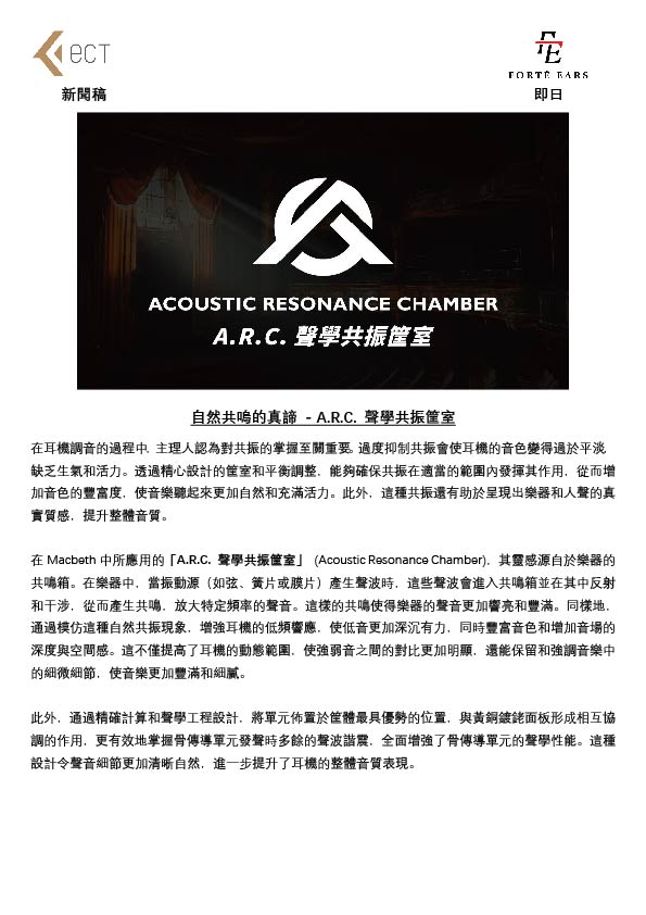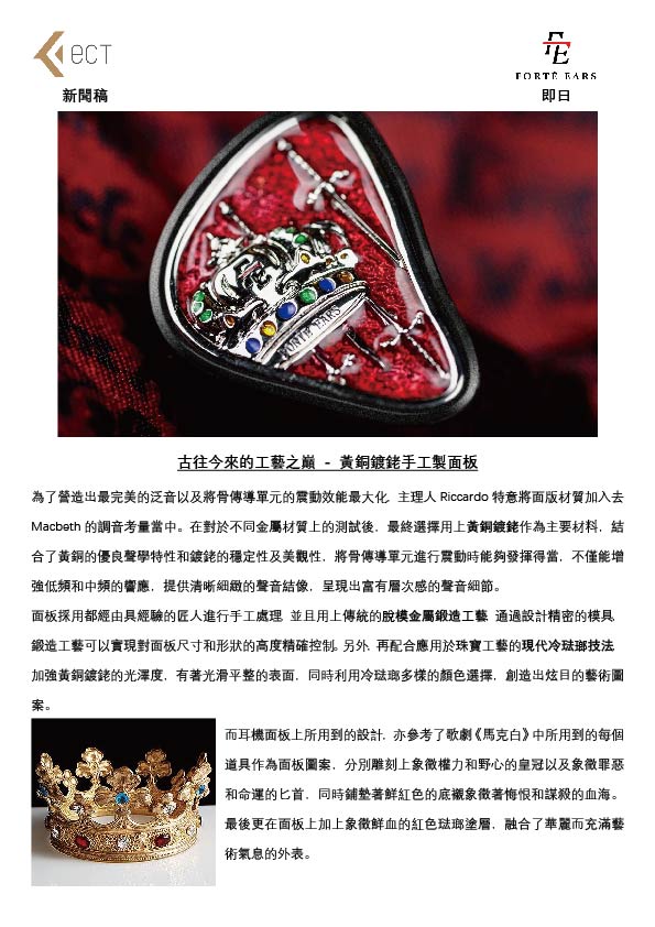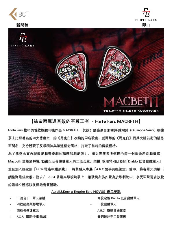 為了能夠忠實再現歌劇和音樂劇的精髓和戲劇張力,捕捉表演者所傳達的每一個細微差別和情感,Macbeth建基於靜電、動鐵以及骨傳導單元的三混合單元架構,採用特別研發的「Diablo低音動鐵單元」,並且加入獨家的「F.C.R.電路中繼系統」,將其融入專屬「A.R.C.聲學共振筐室」當中,將各單元的輸出調整到最佳狀態。務求在2024香港高級視聽展上,讓發燒友仿如置身於歌劇院中,享受兩聲道音效般的臨場立體感以及極緻音質體驗。