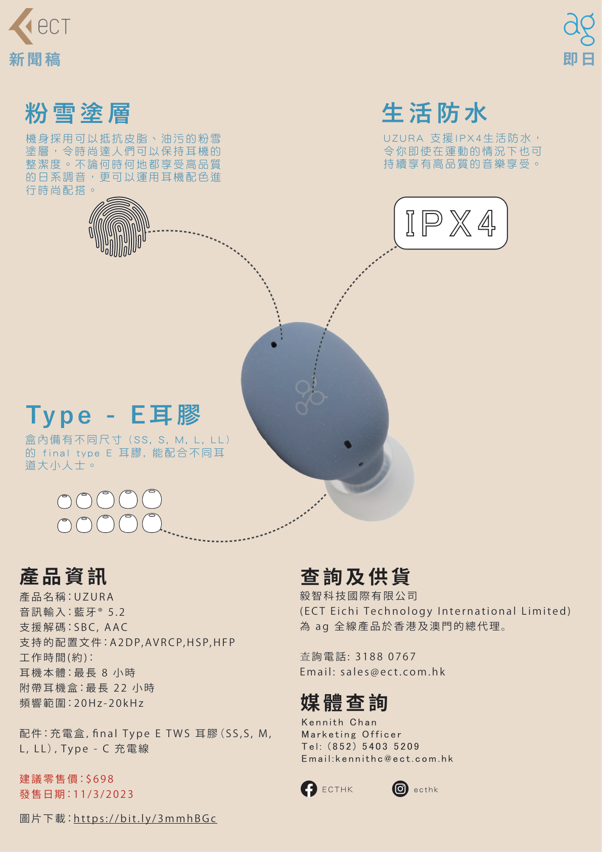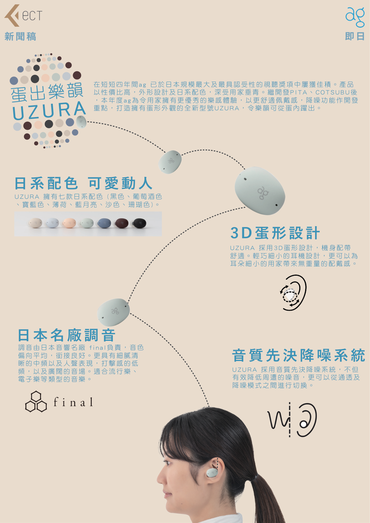 在短短四年間ag 已於日本規模最大及最具認受性的視聽獎項中屢獲佳積。產品以性價比高,外形設計及日系配色,深受用家垂青。繼開發PITA、COTSUBU後, 本年度ag為令用家擁有更優秀的樂感體驗, 以更舒適佩戴感,降噪功能作開發重點,打造擁有蛋形外觀的全新型號UZURA,令樂韻可從蛋內躍出。
