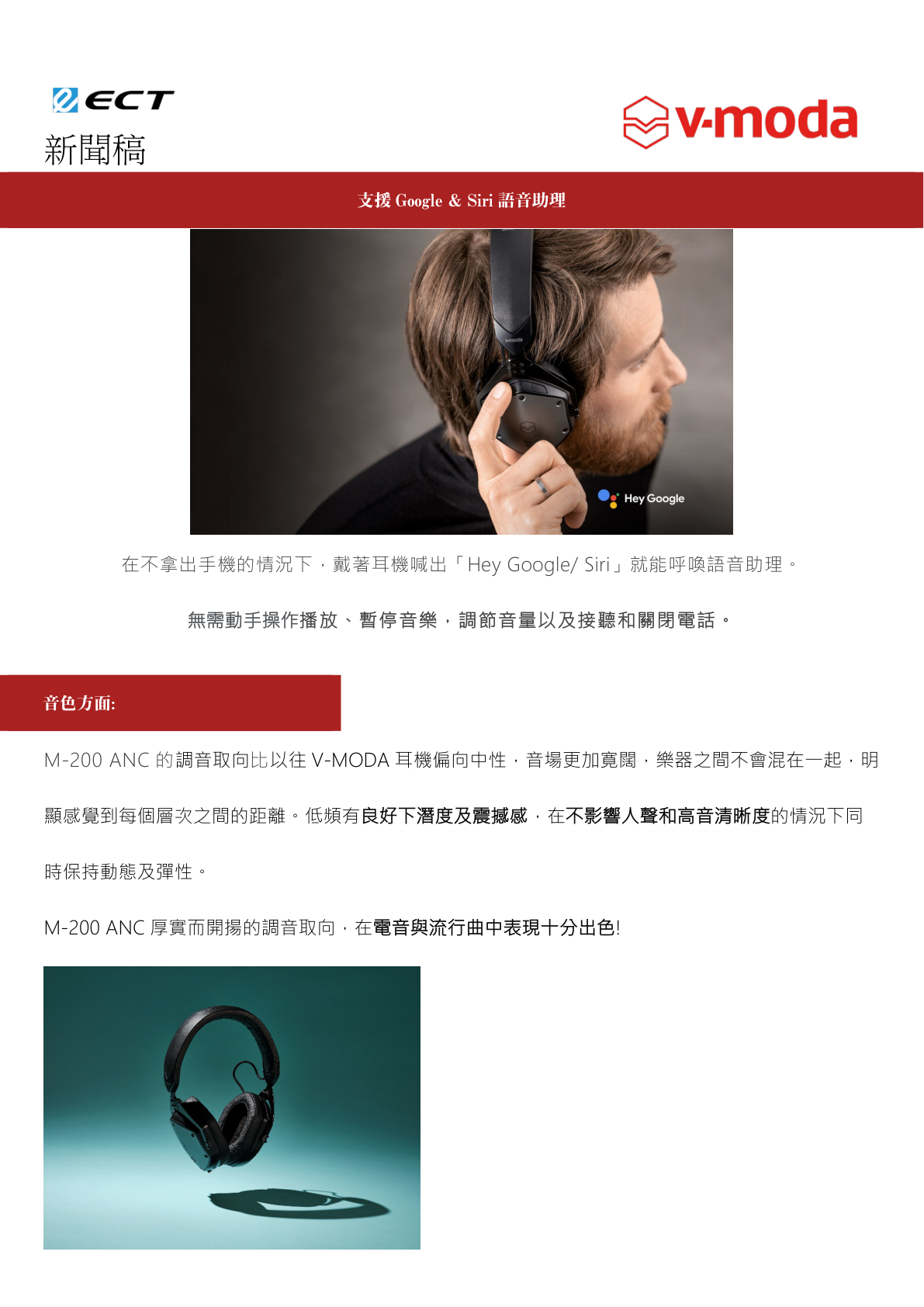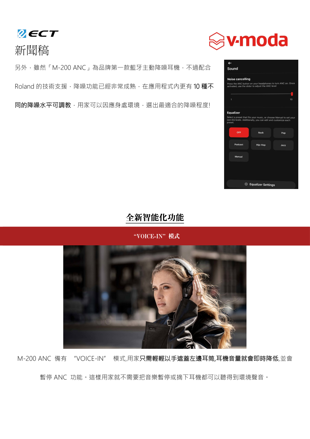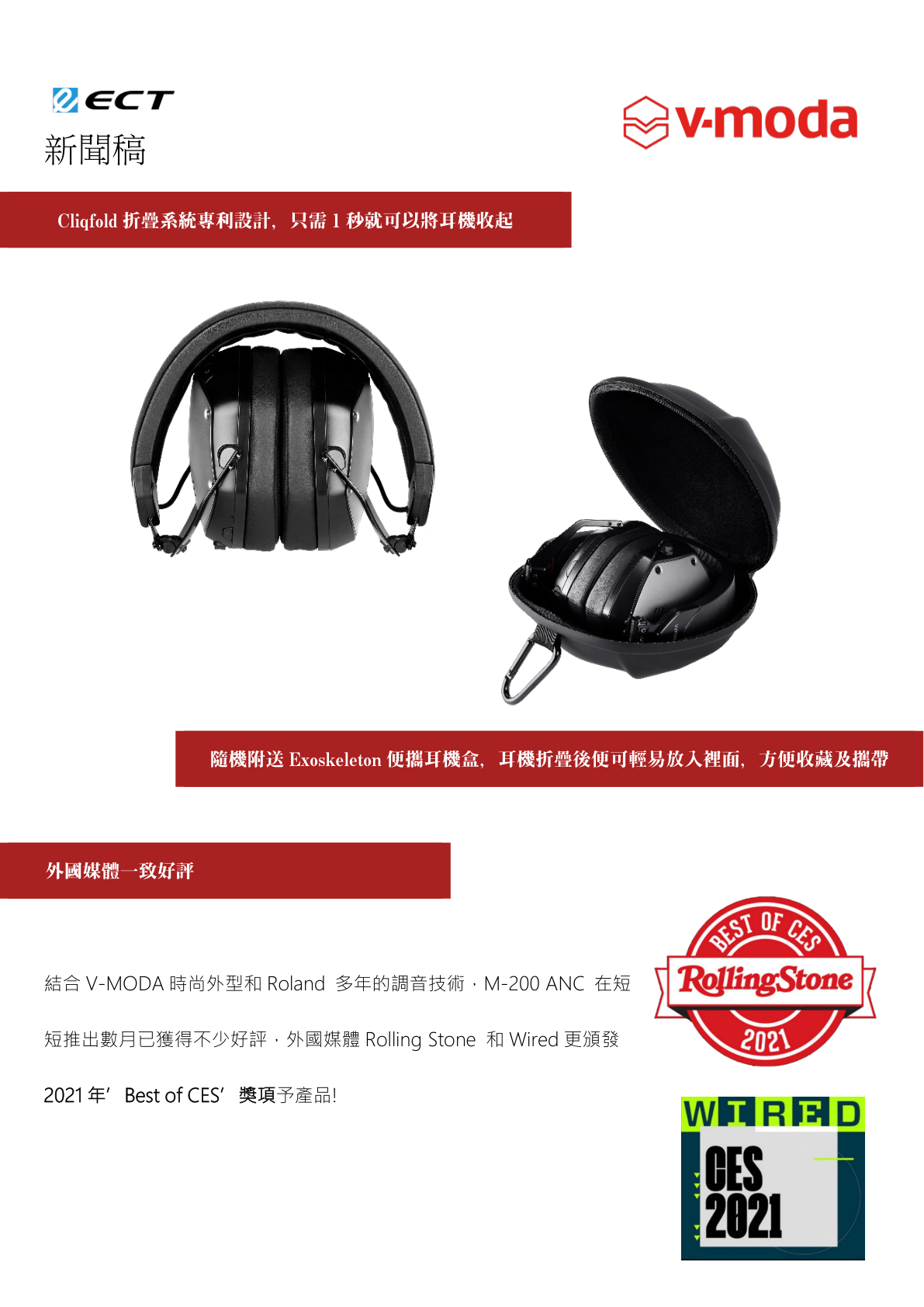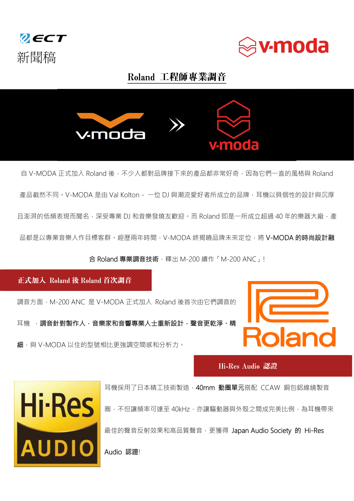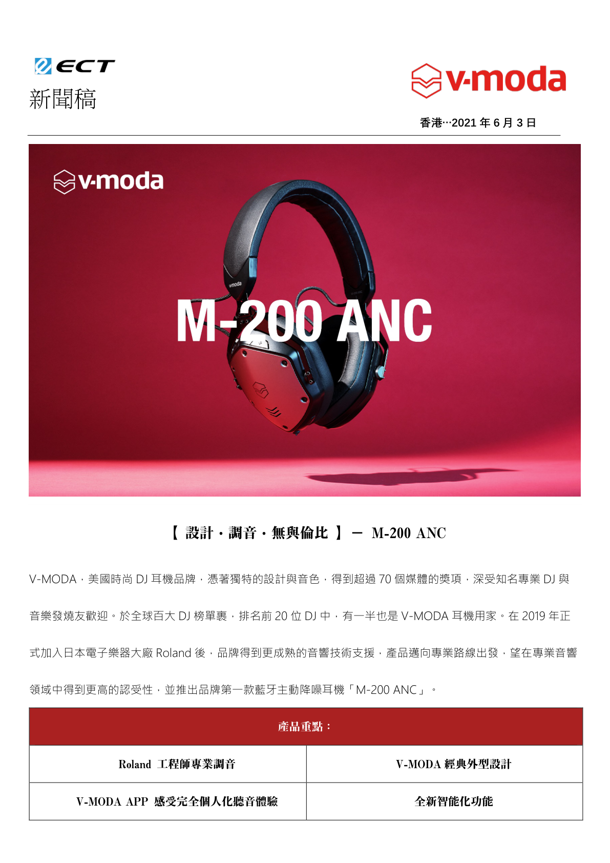 V-MODA,美國時尚 DJ 耳機品牌,憑著獨特的設計與音色,得到超過 70 個媒體的獎項,深受知名專業 DJ 與音樂發燒友歡迎。於全球百大 DJ 榜單裹,排名前 20 位 DJ 中,有一半也是 V-MODA 耳機用家。在 2019 年正式加入日本電子樂器大廠 Roland 後,品牌得到更成熟的音響技術支援,產品邁向專業路線出發,望在專業音響領域中得到更高的認受性,並推出品牌第一款藍牙主動降噪耳機「M-200 ANC」。