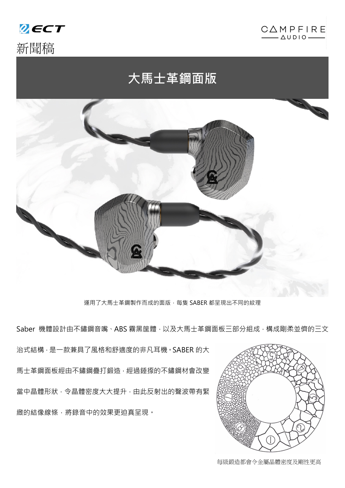 美國 Campfire Audio 發佈最新耳機作品 SABER, 採用品牌首次使用的兩圈一鐵單元結構,以 6mm納米鈦金屬動圈呈現出溫暖、細緻的中音;配合 8mm 混合式鈹動圈創造出更深潛的低頻;加上精準的高音動鐵單元,譜出品牌魅力的極上三重奏。SABER 特別加入由大馬士革鋼製造的標誌性面板,每對都呈現出獨特又令人目不暇給的紋理,構成了一款兼具風格和舒適度的非凡耳機。