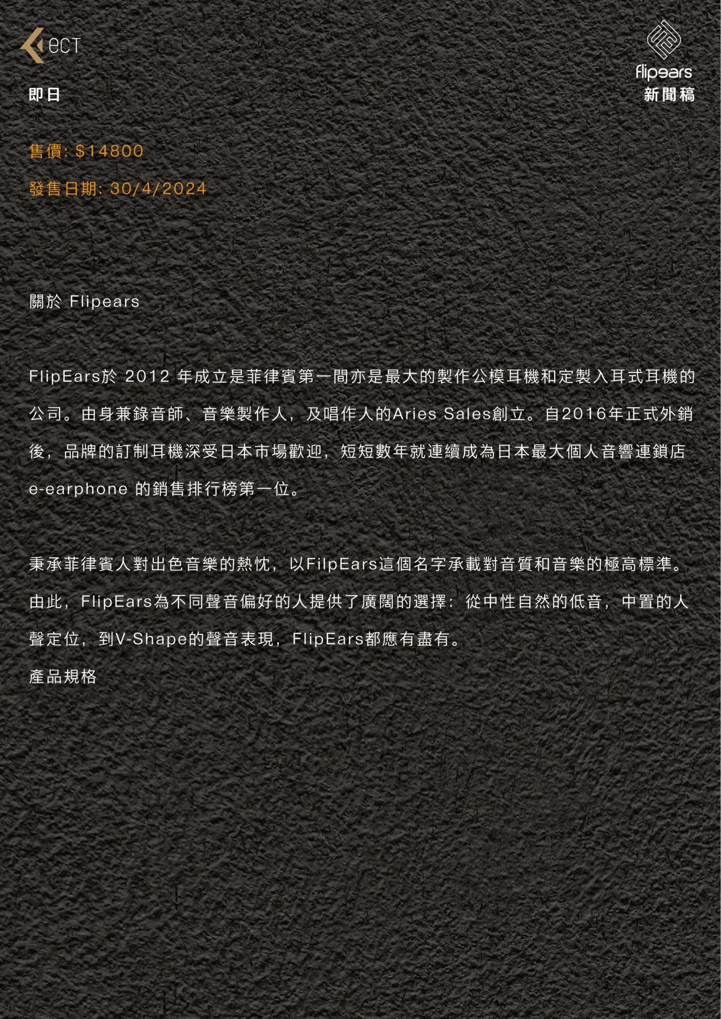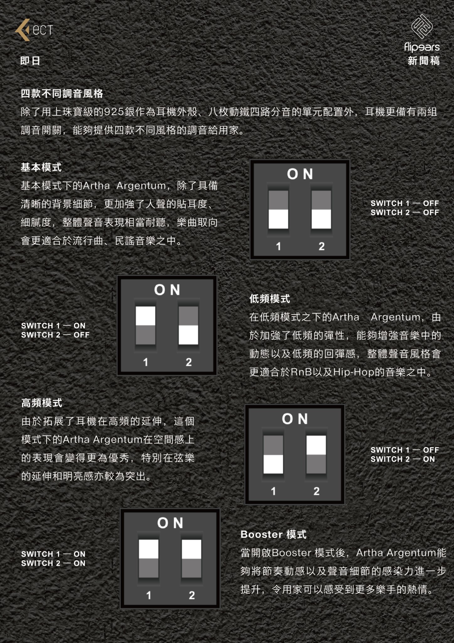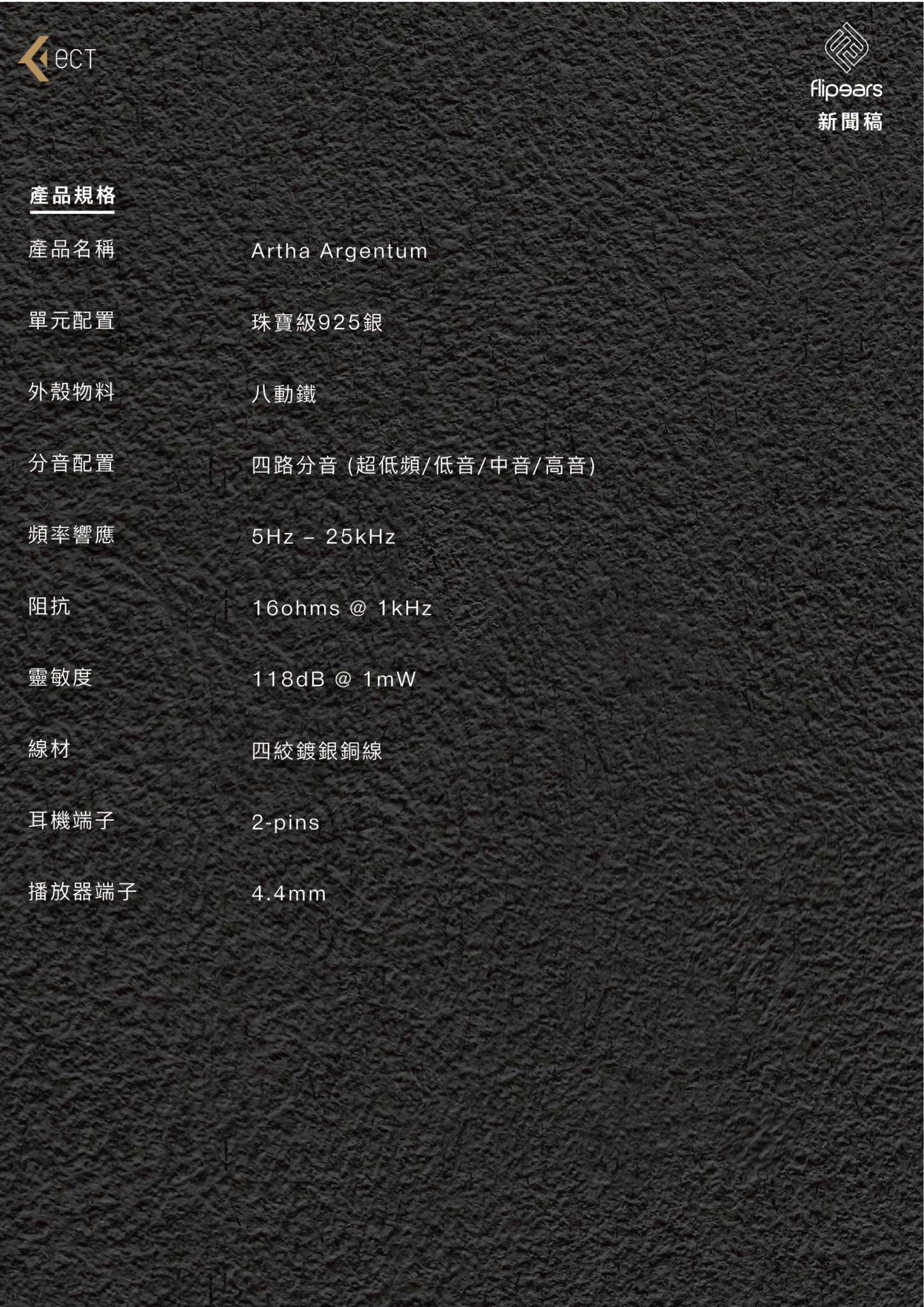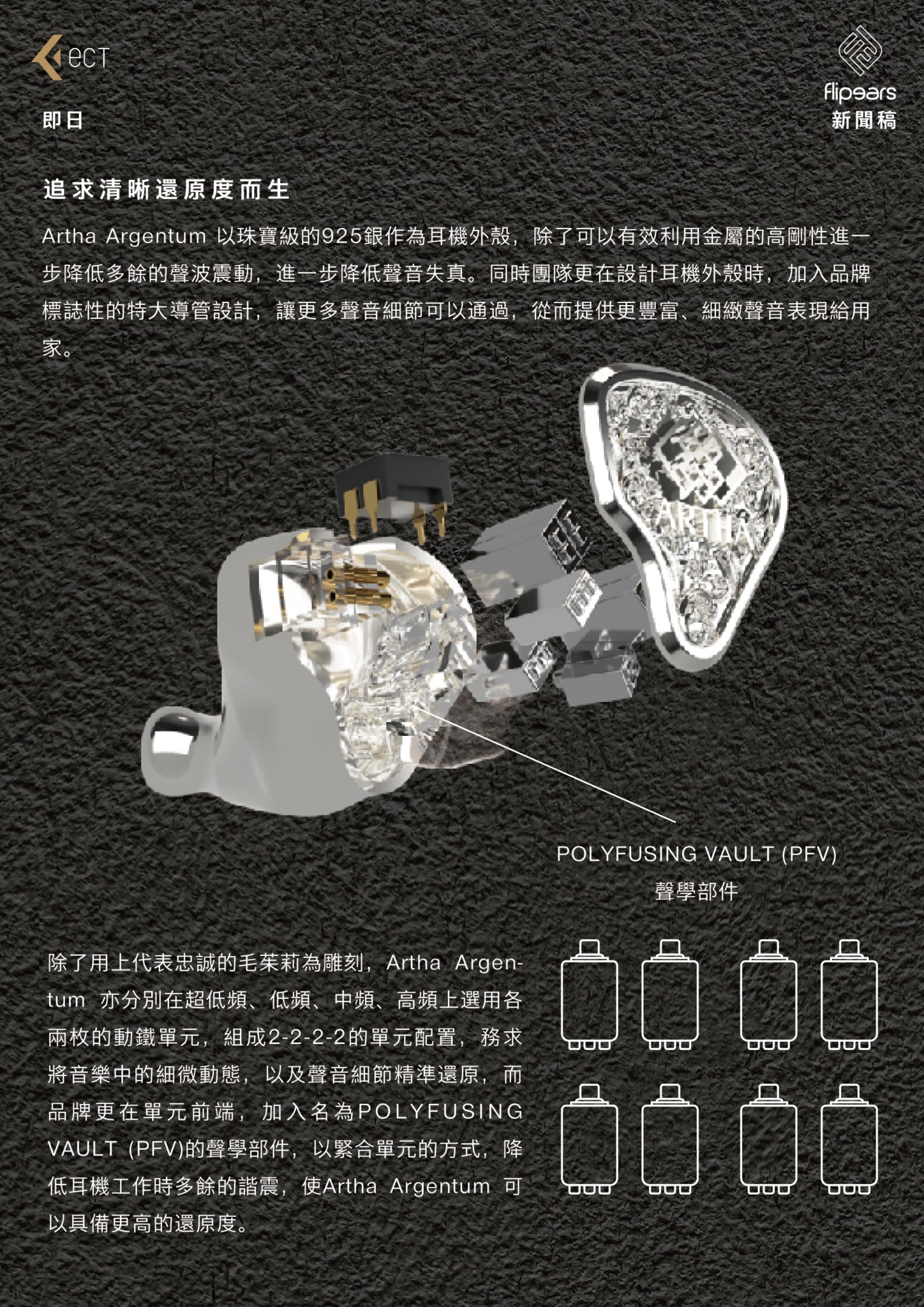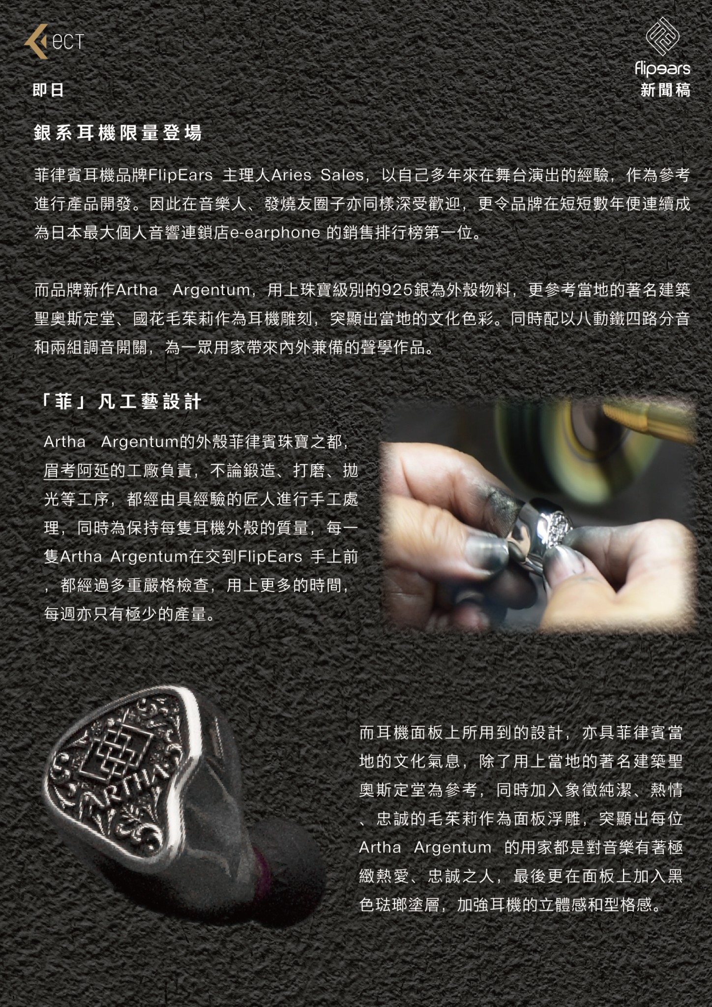 菲律賓耳機品牌FlipEars 主理人Aries Sales,以自己多年來在舞台演出的經驗,作為參考進行產品開發。因此在音樂人、發燒友圈子亦同樣深受歡迎,更令品牌在短短數年便連續成為日本最大個人音響連鎖店e-earphone 的銷售排行榜第一位。 而品牌新作Artha Argentum,用上珠寶級別的925銀為外殼物料,更參考當地的著名建築聖奧斯定堂、國花毛茱莉作為耳機雕刻,突顯出當地的文化色彩。同時配以八動鐵四路分音和兩組調音開關,為一眾用家帶來內外兼備的聲學作品。
