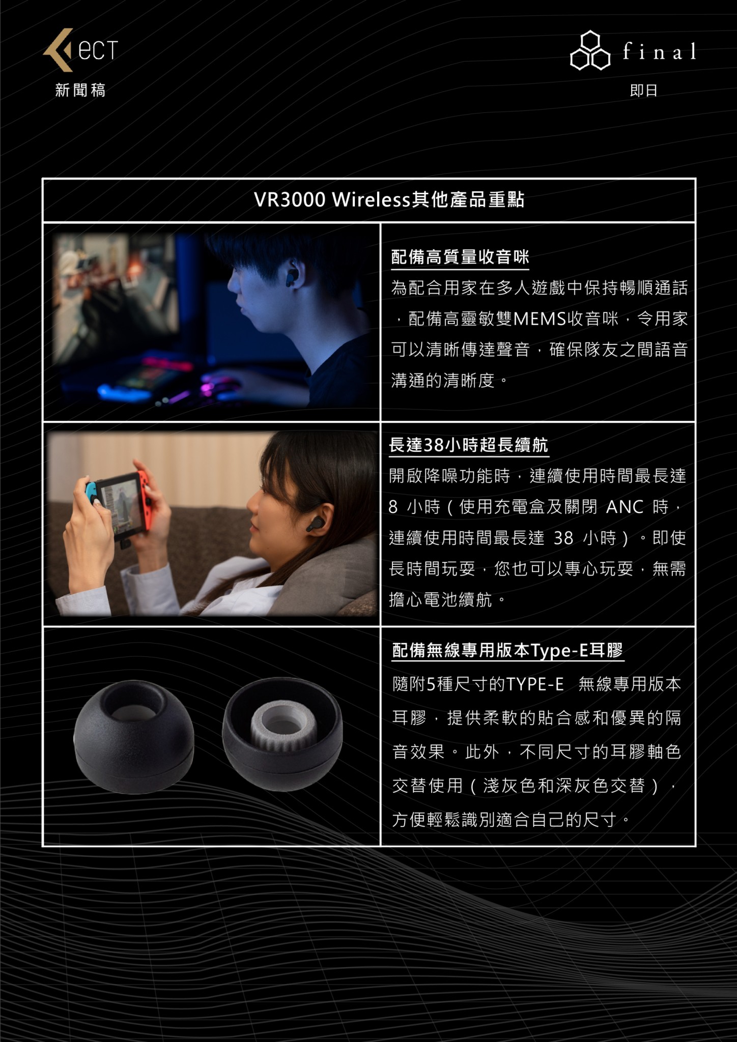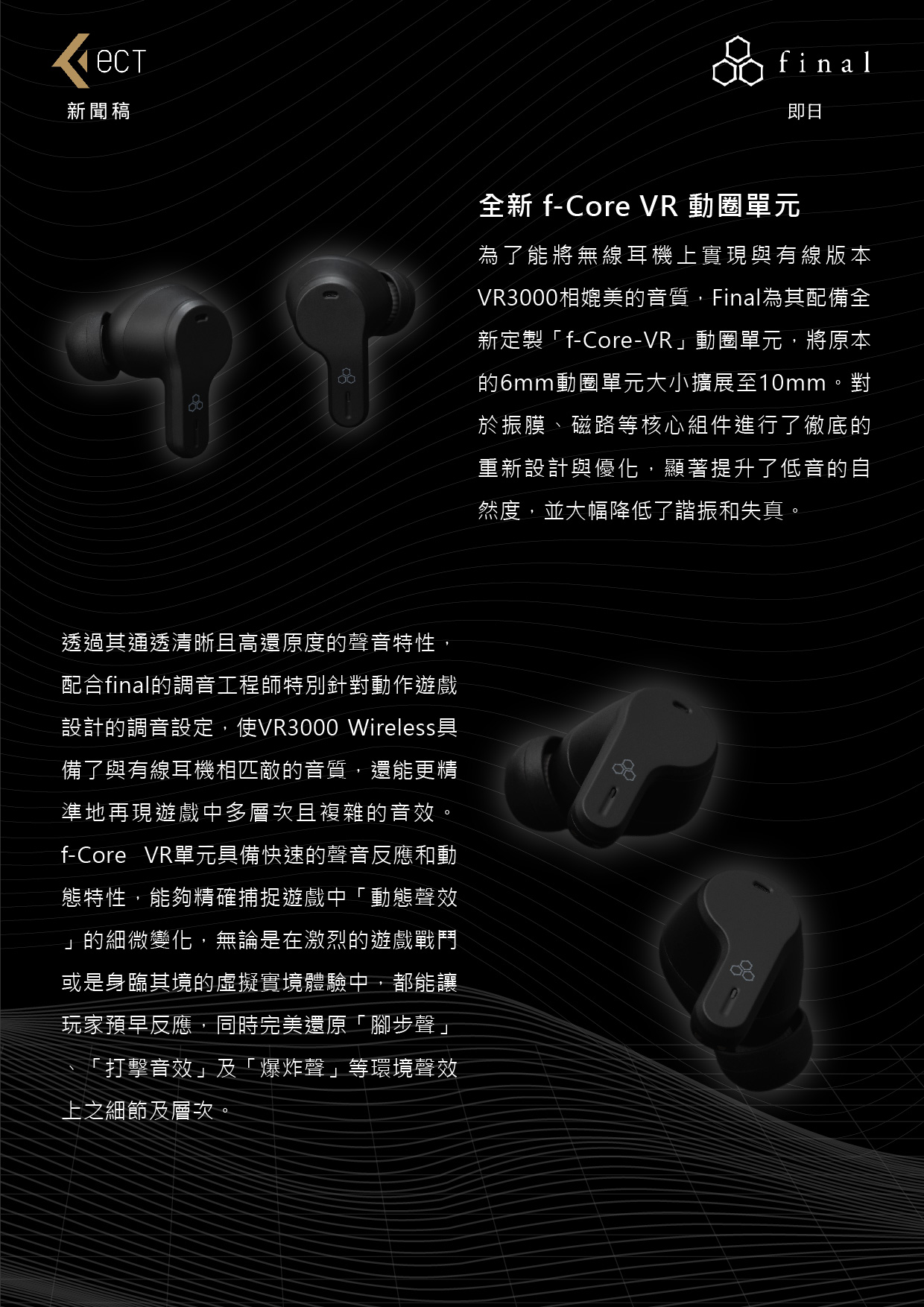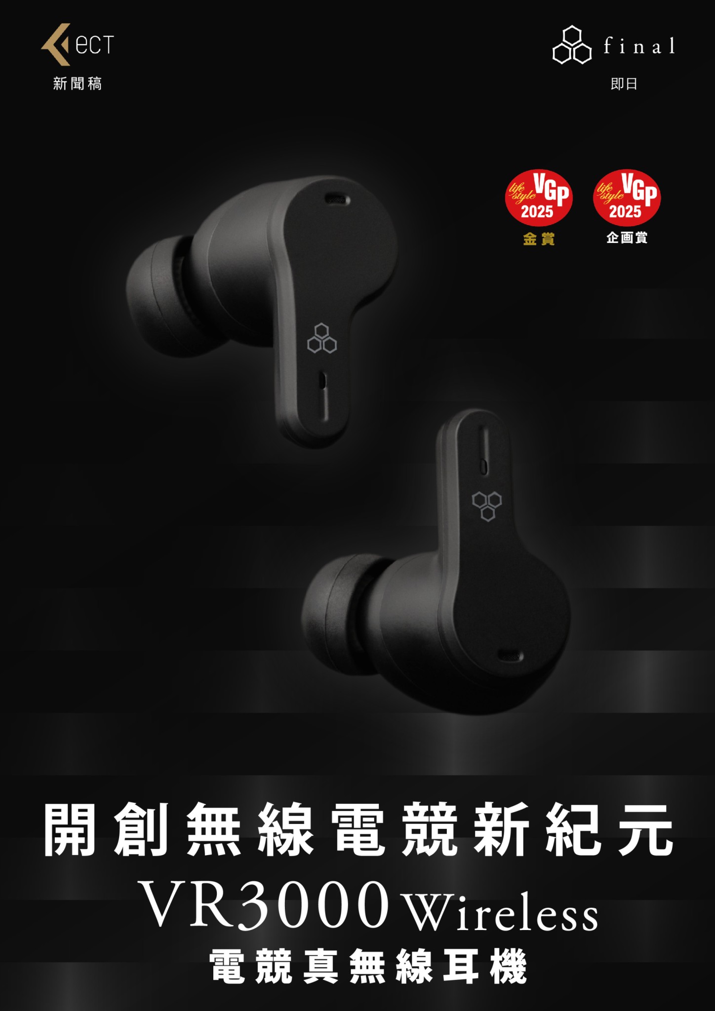 最新推出的VR3000 Wireless真無線耳機,是以累計出貨量已超過15萬的「VR3000 for Gaming」有線電競耳機為原型,實現無線化的最終成果。於單元配置上首次搭載自主開發的 「f-Core VR」10mm動圈單元,能夠忠實再現聲學空間的精細影像.同時提供媲美有線連接的「20ms超低延遲連接」USB-C接收器,並且加入減輕降噪疲勞的低壓迫「Hybrid-ANC」降噪技術功能,能讓玩家在舒適無負擔的場境下盡情享受清晰、精確的聲音定位和真實的音效細節,進一步提升了遊戲中的沉浸感和實時反應能力。