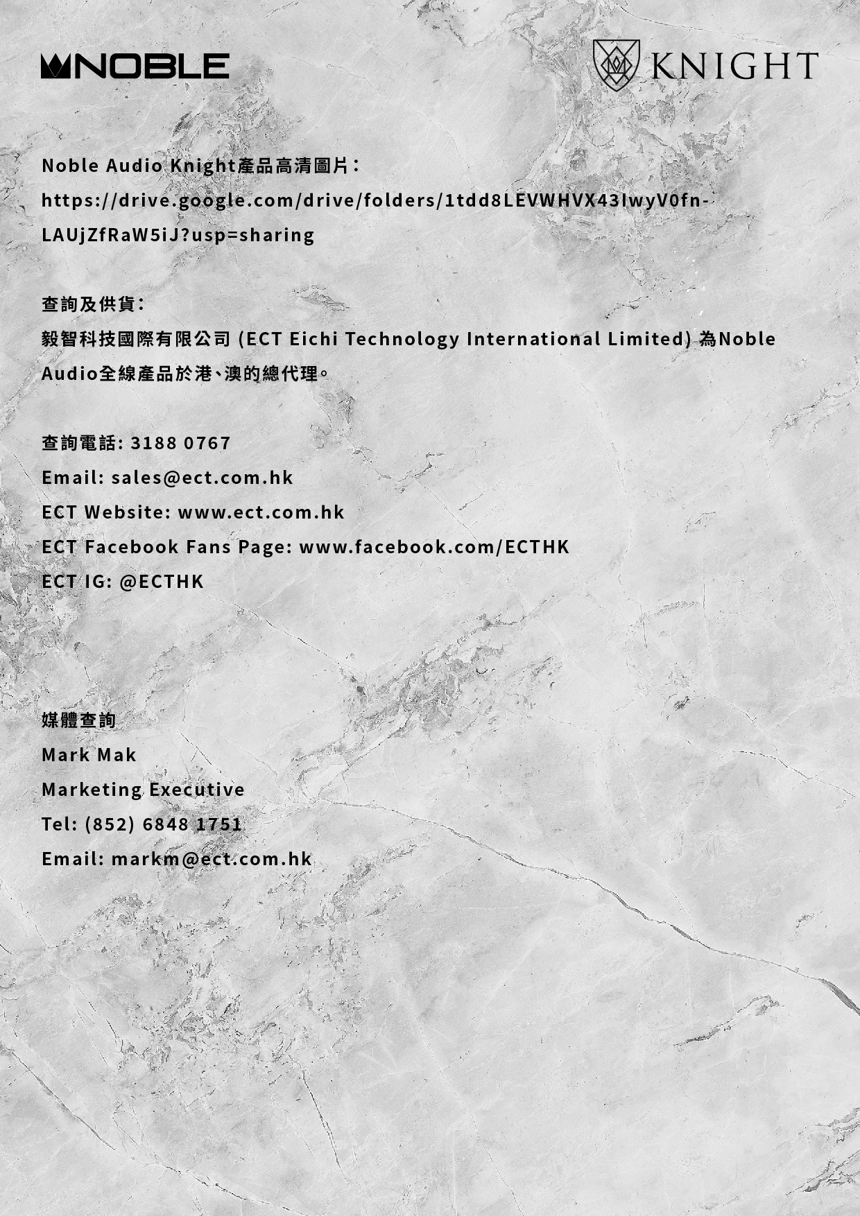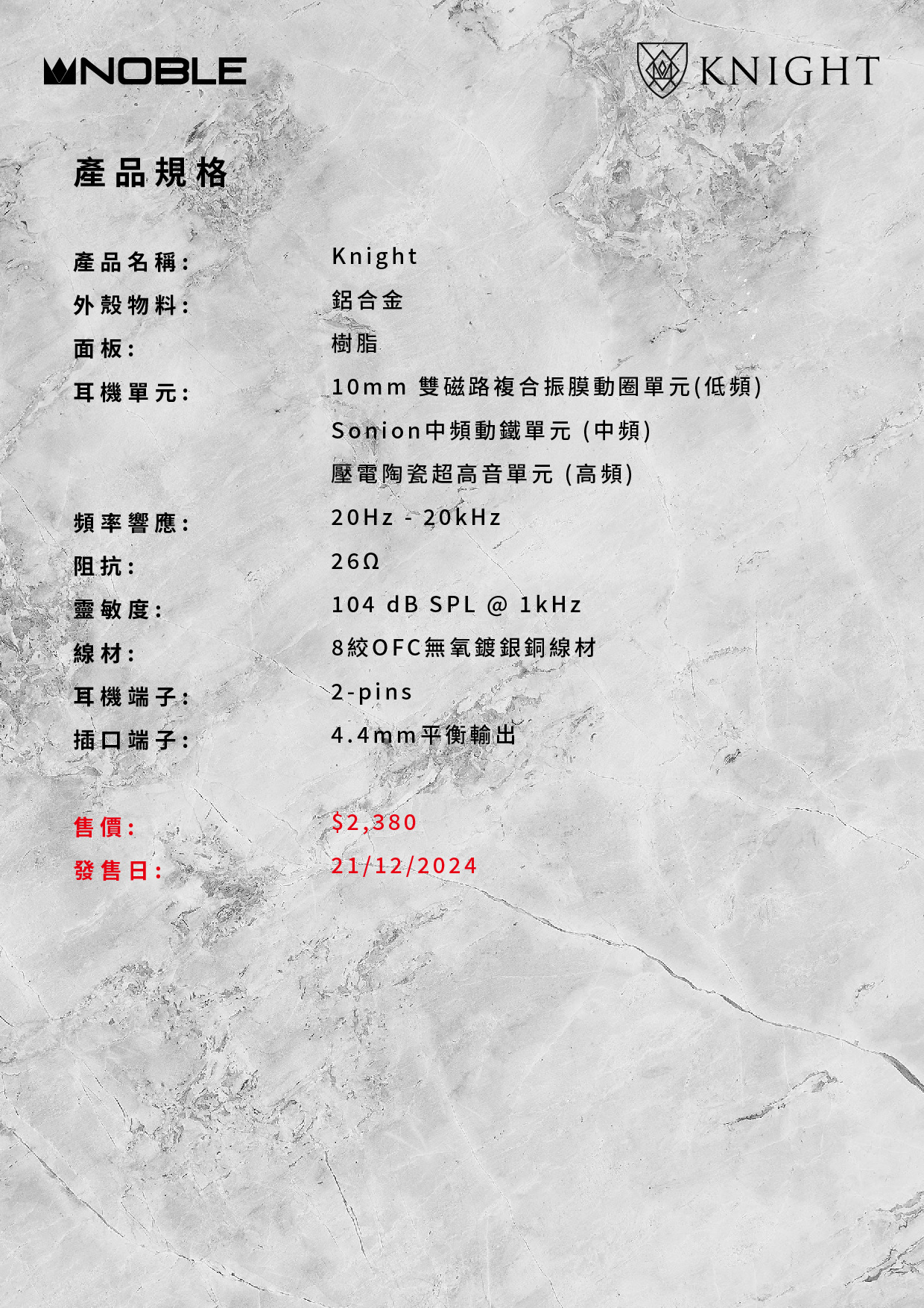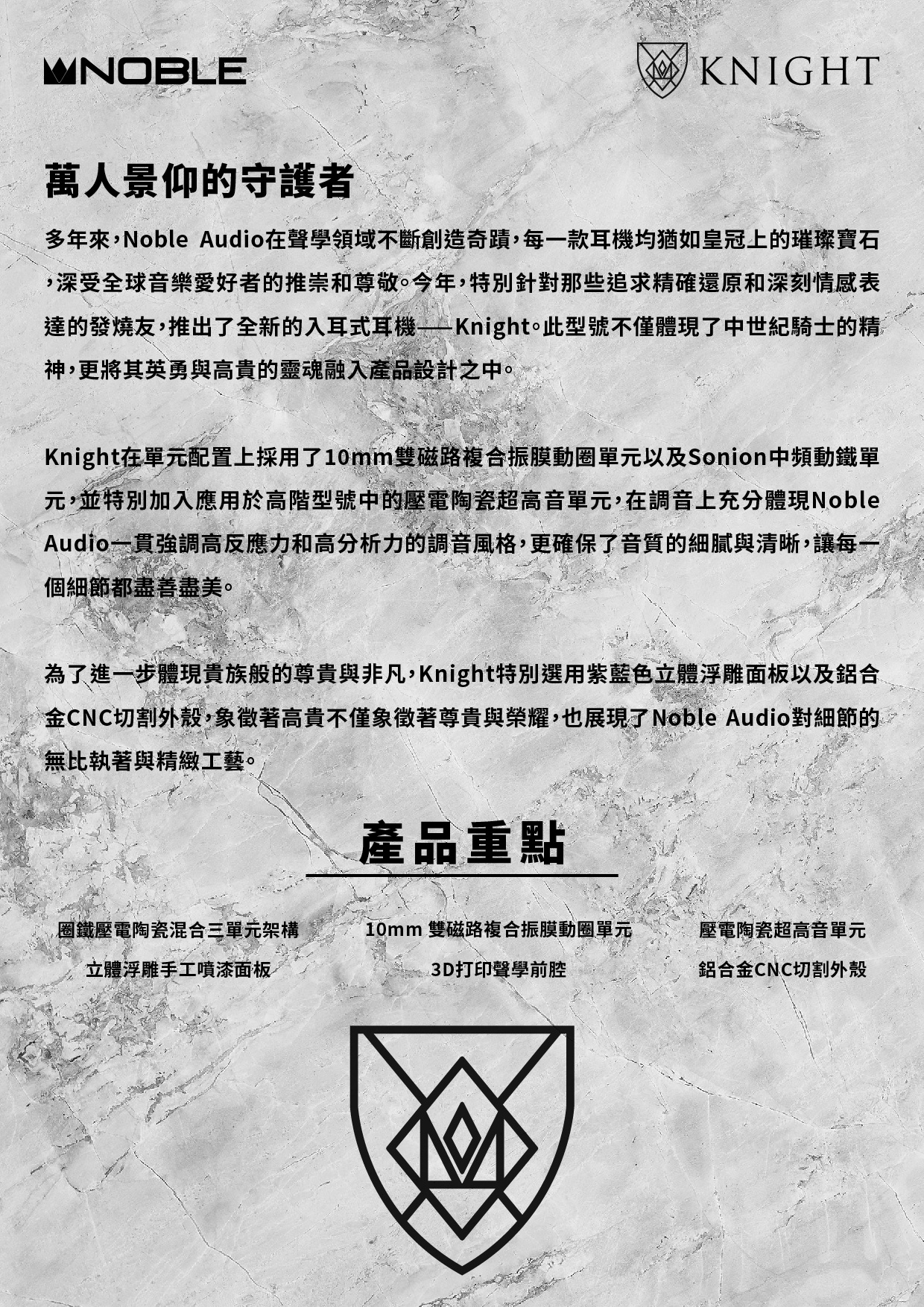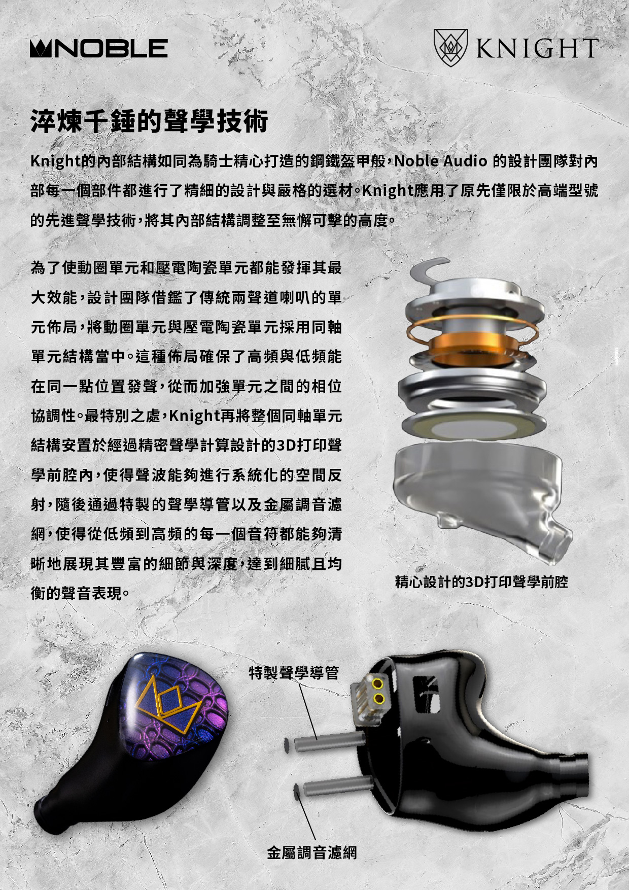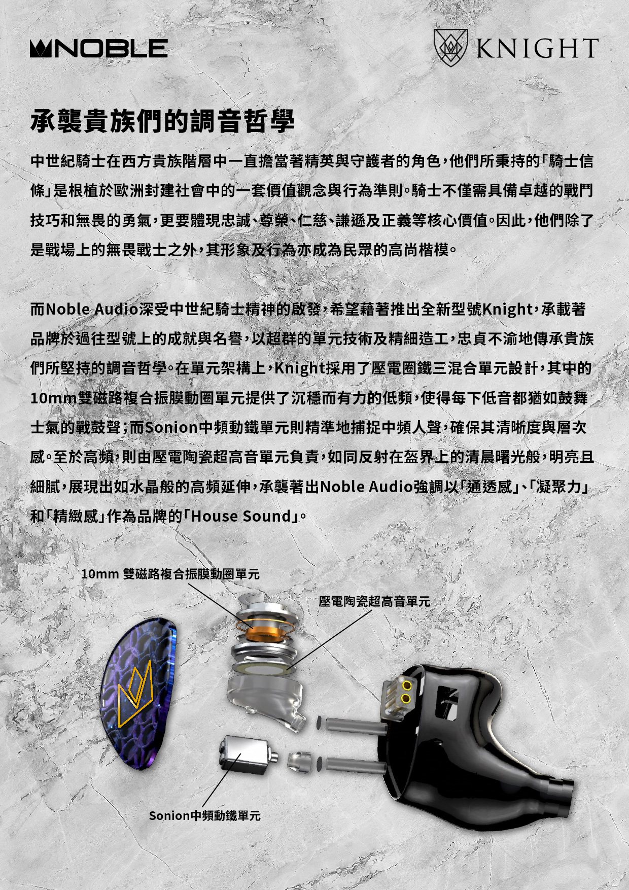 Knight在單元配置上採用了10mm雙磁路複合振膜動圈單元以及Sonion中頻動鐵單元,並特別加入應用於高階型號中的壓電陶瓷超高音單元,在調音上充分體現Noble Audio一貫強調高反應力和高分析力的調音風格,更確保了音質的細膩與清晰,讓每一個細節都盡善盡美。