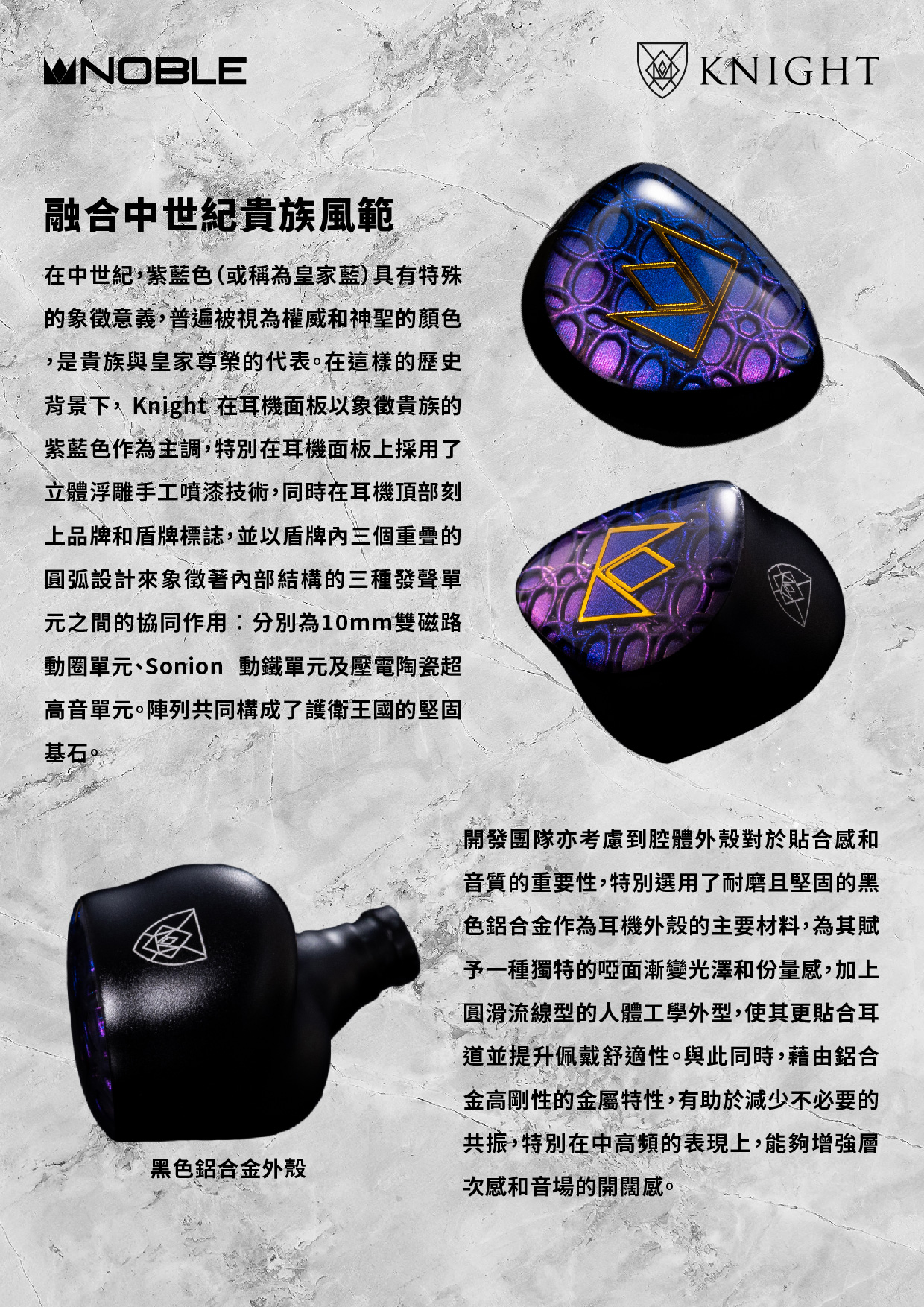 為了進一步體現貴族般的尊貴與非凡,Knight特別選用紫藍色立體浮雕面板以及鋁合金CNC切割外殼,象徵著高貴不僅象徵著尊貴與榮耀,也展現了Noble Audio對細節的無比執著與精緻工藝。