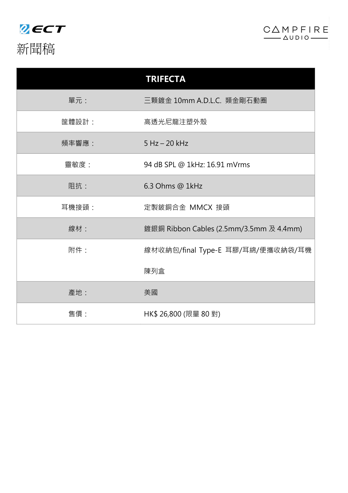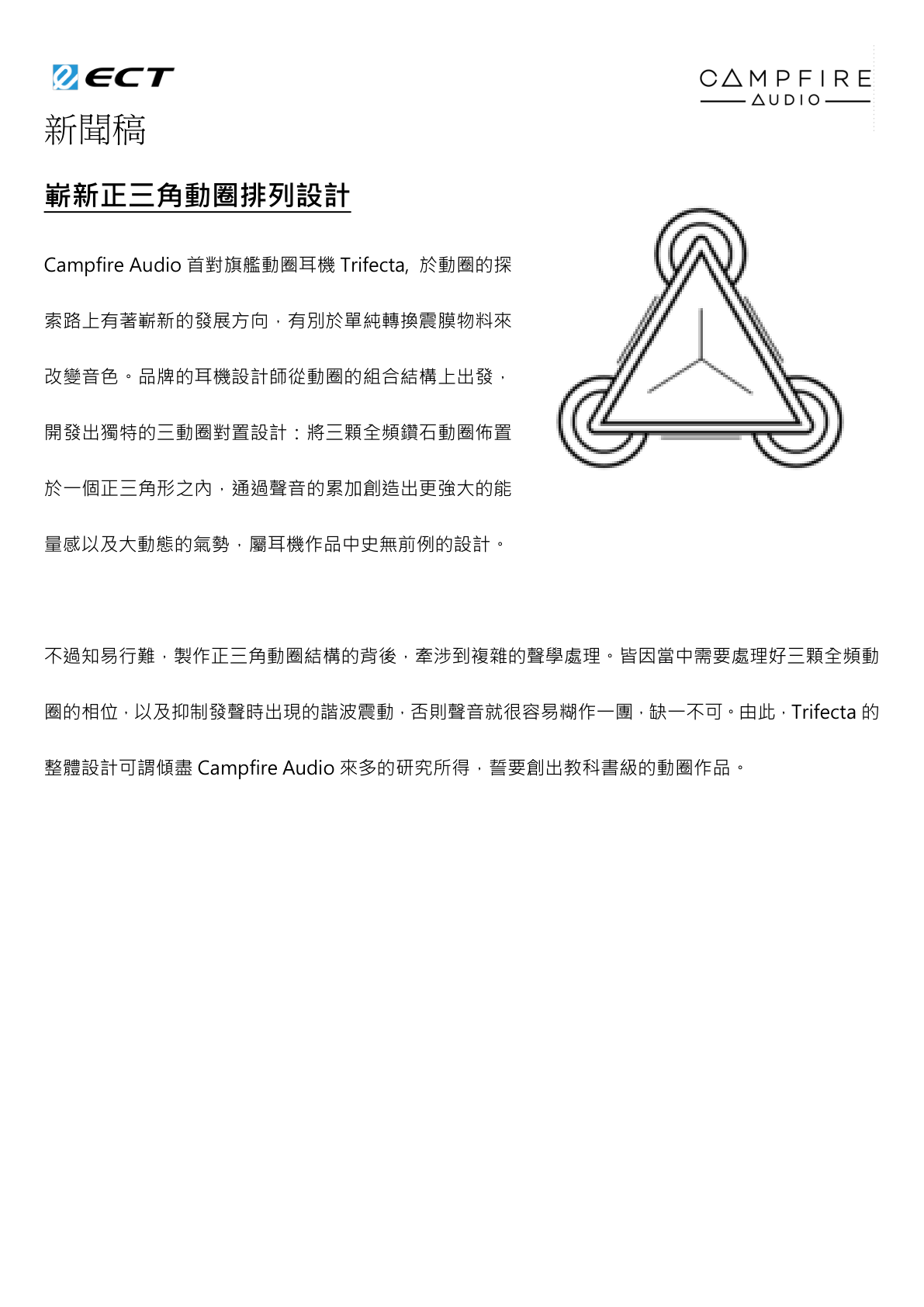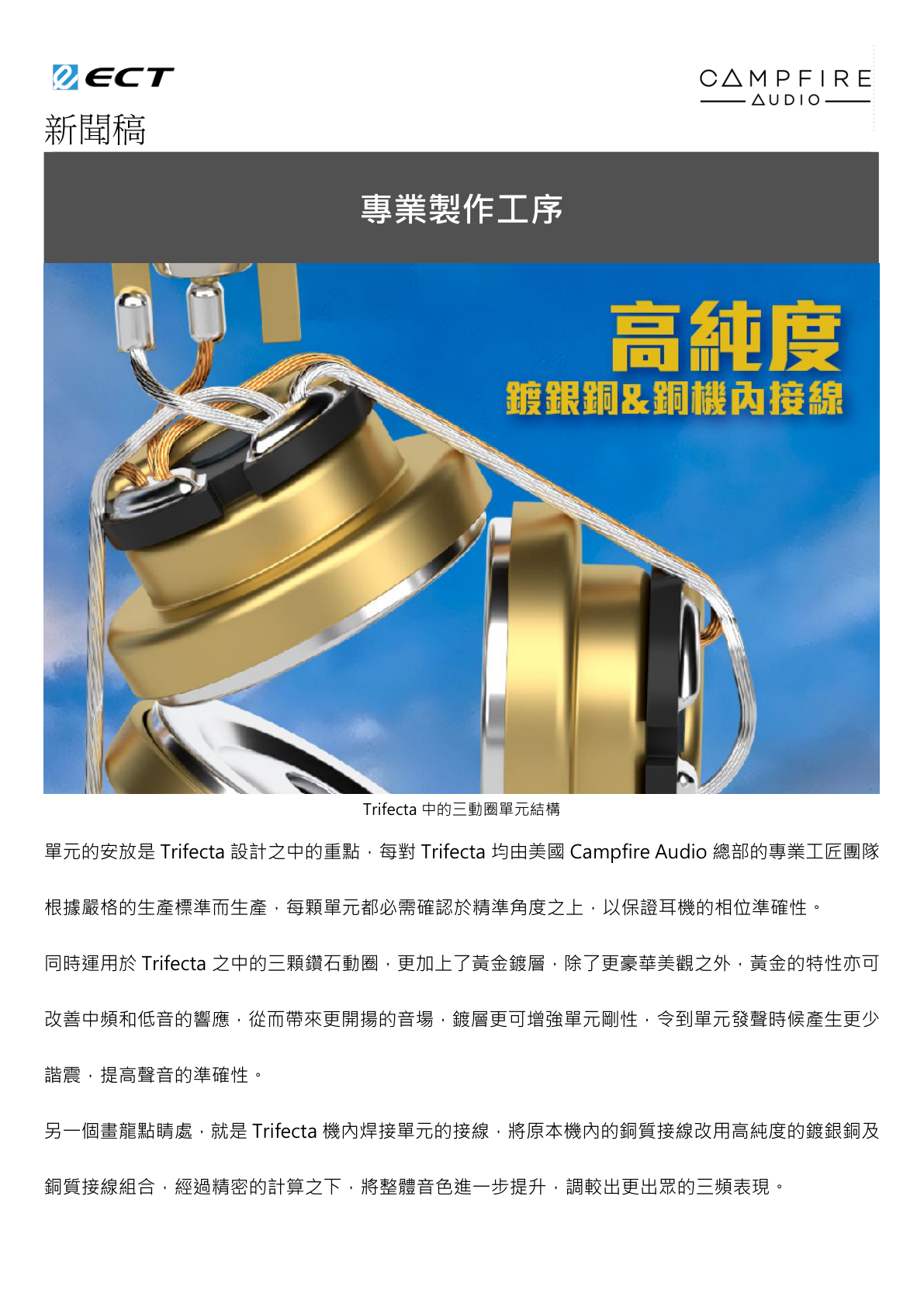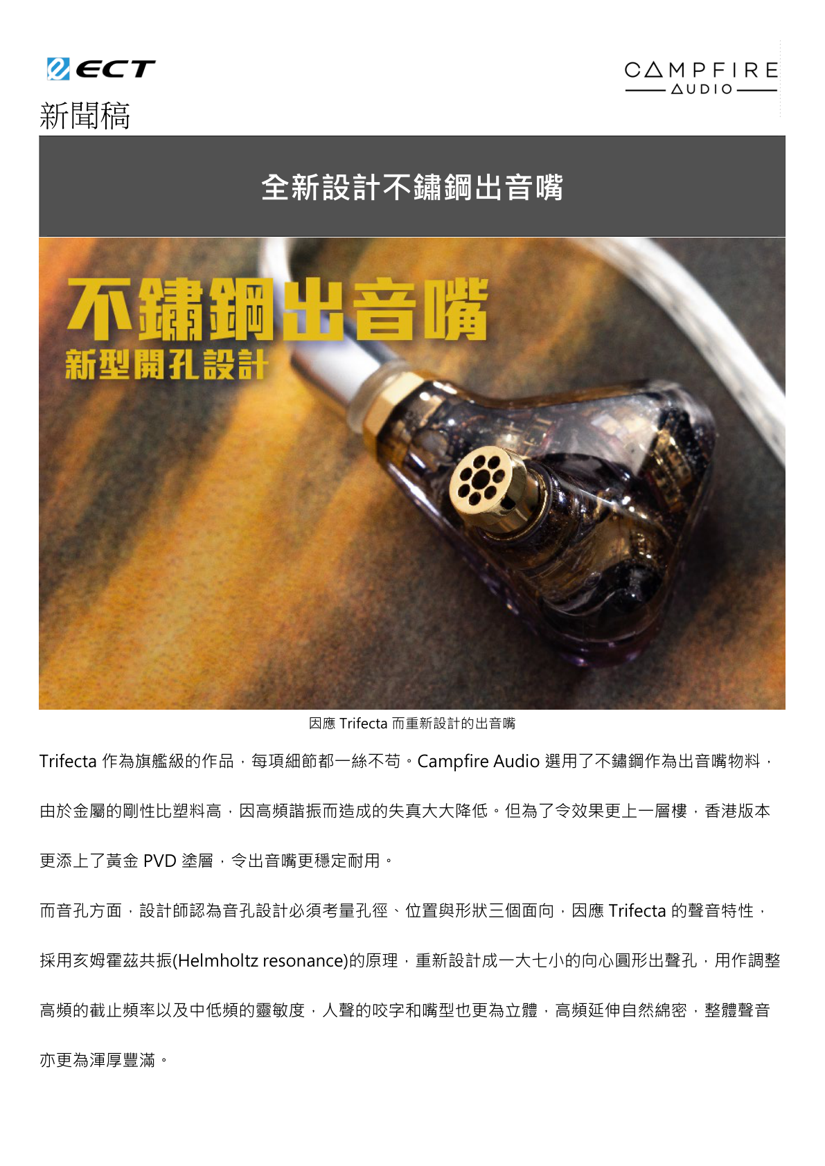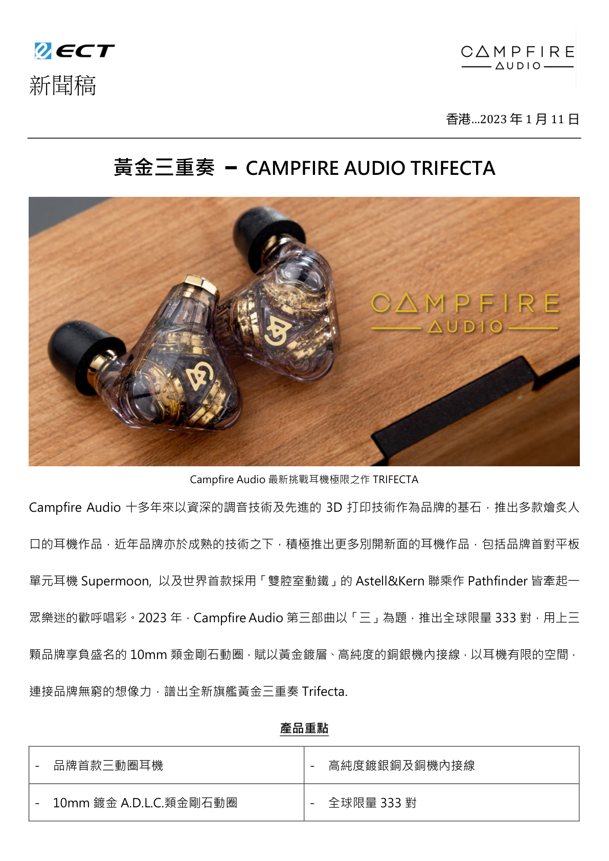 Campfire Audio 十多年來以資深的調音技術及先進的 3D 打印技術作為品牌的基石,推出多款燴炙人口的耳機作品,近年品牌亦於成熟的技術之下,積極推出更多別開新面的耳機作品,包括品牌首對平板單元耳機 Supermoon, 以及世界首款採用「雙腔室動鐵」的 Astell&Kern 聯乘作 Pathfinder 皆牽起一眾樂迷的歡呼唱彩。2023 年,Campfire Audio 第三部曲以「三」為題,推出全球限量 333 對,用上三顆品牌享負盛名的 10mm 類金剛石動圈,賦以黃金鍍層、高純度的銅銀機內接線,以耳機有限的空間,連接品牌無窮的想像力,譜出全新旗艦黃金三重奏 Trifecta