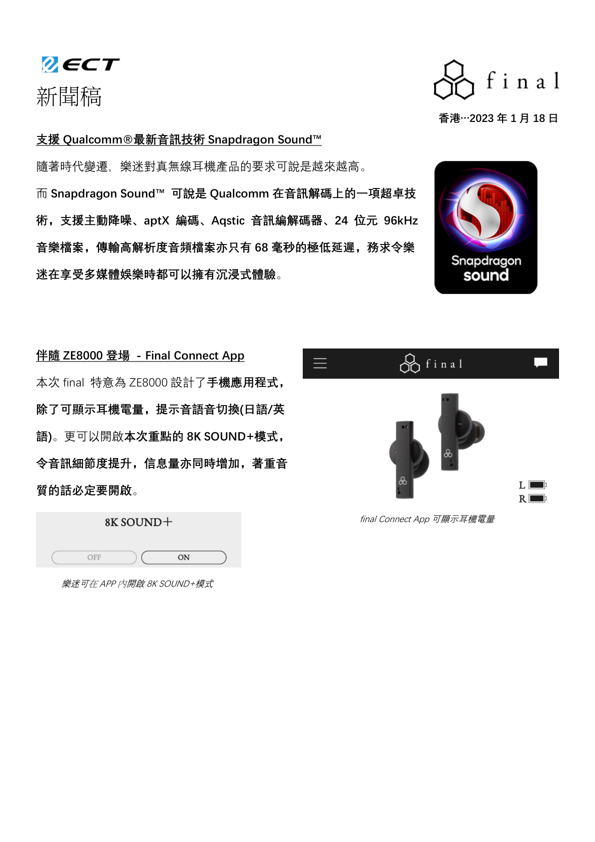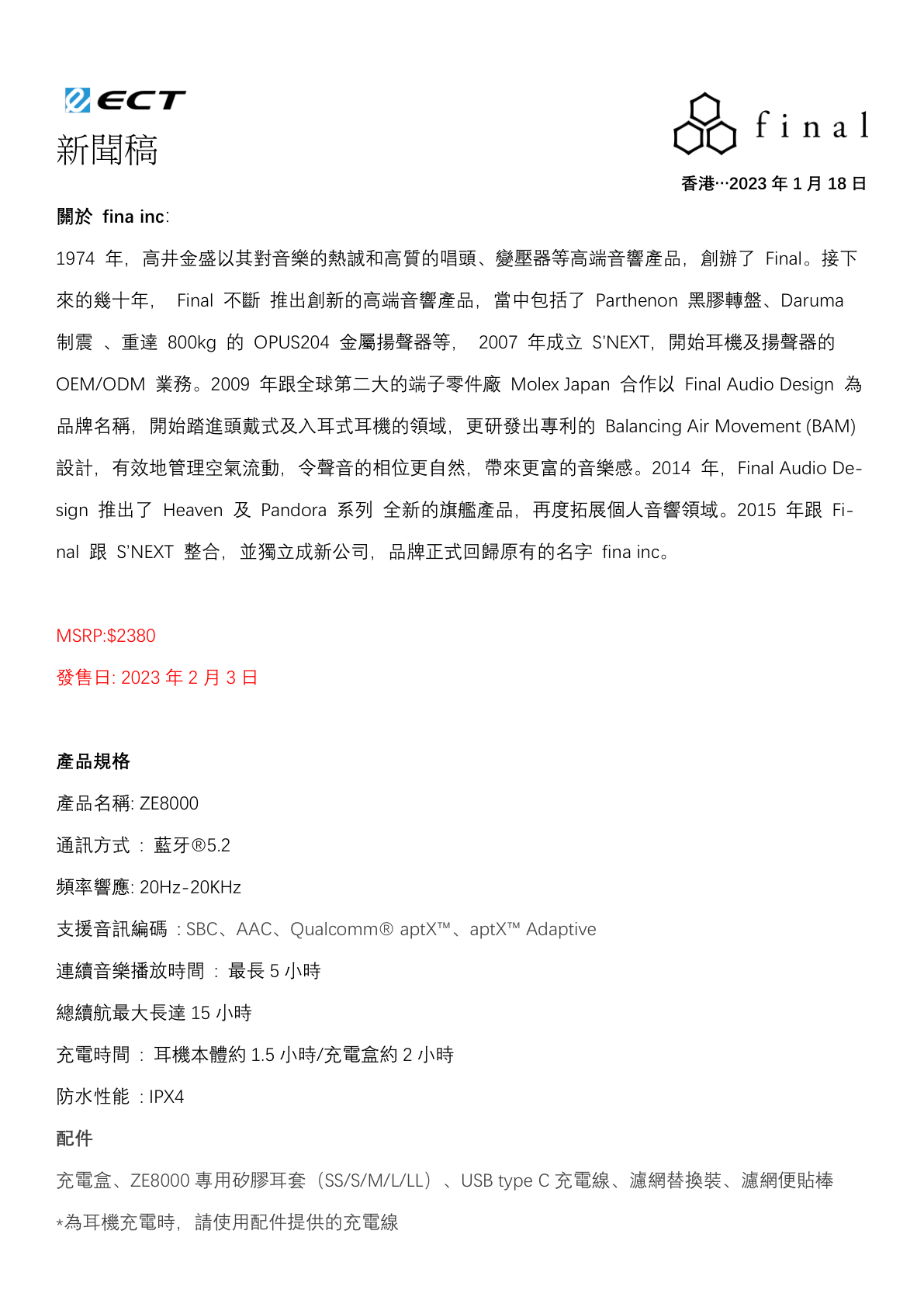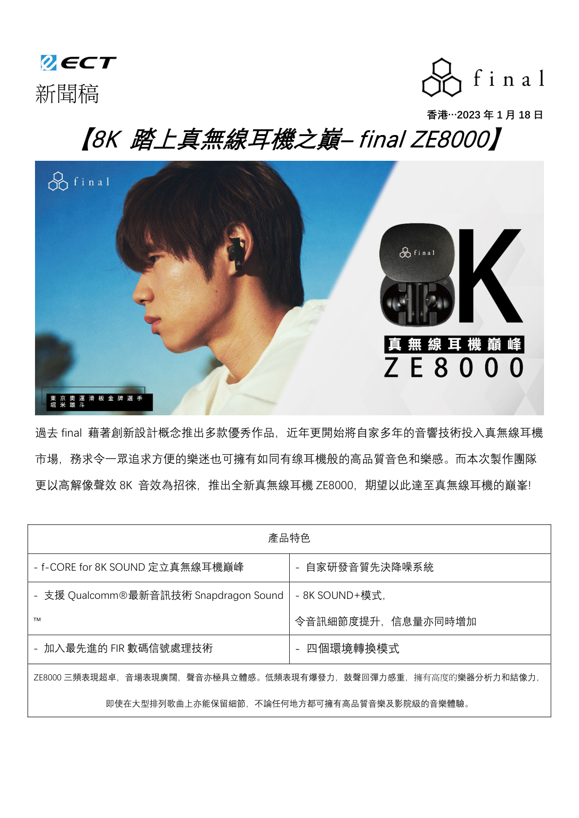 過去 final 藉著創新設計概念推出多款優秀作品,近年更開始將自家多年的音響技術投入真無線耳機市場,務求令一眾追求方便的樂迷也可擁有如同有缐耳機般的高品質音色和樂感。而本次製作團隊更以高解像聲效 8K 音效為招徠,推出全新真無線耳機 ZE8000,期望以此達至真無線耳機的巔峯!