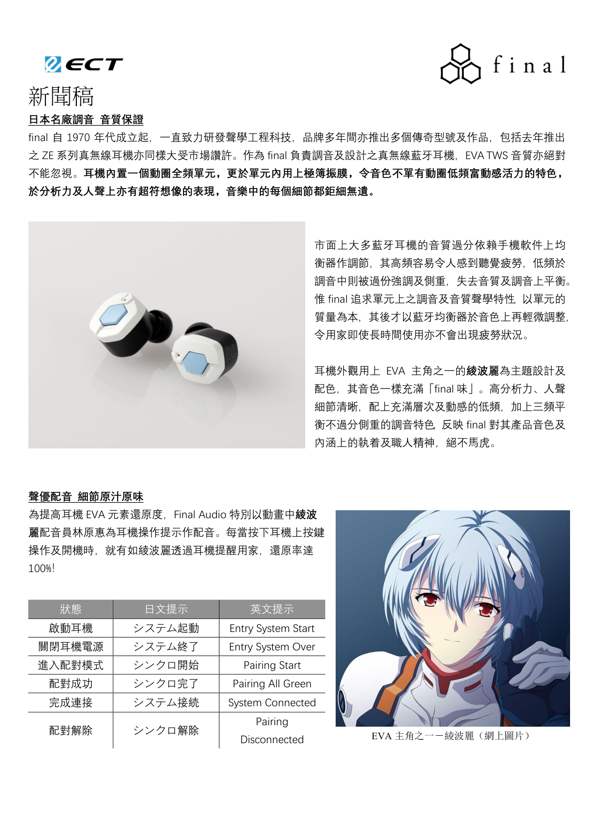 日本耳機設計品牌 Final Audio 於 2020 年首次與日本電視台合作,推出【EVA2020 × final 聯名款 TWS 耳機】,當中 EVA 初號機、2 號機、6 號機及 NERV 四款配色使一眾 EVA 迷為之瘋狂。