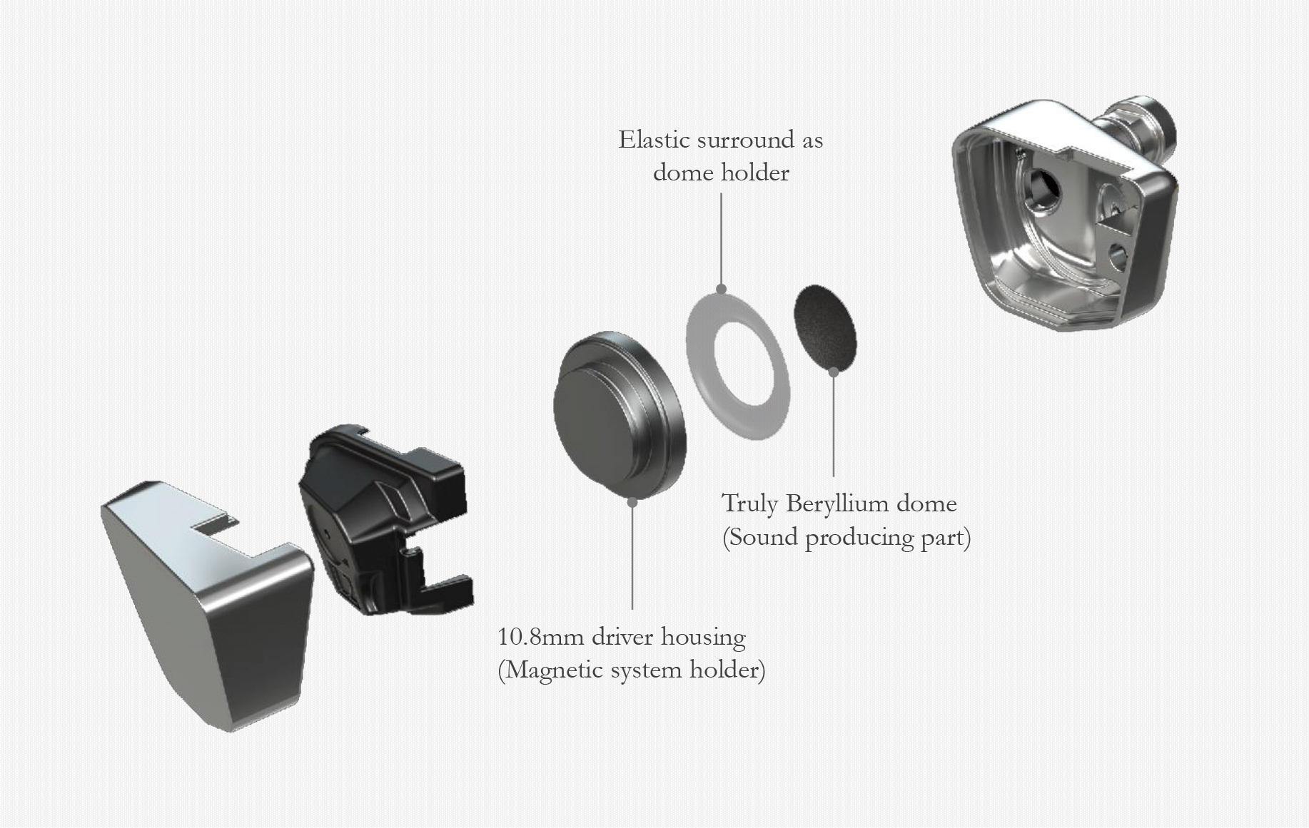 鈹的特性對製造耳機單元非常理想,但原料非常昂貴同時加工純鈹單元非常困難,以往只會出現在極為高端的音箱或頭戴式耳機中。 單元硬,則免於變形所產生的失真。但一般硬的物料都很笨重;笨重的物料會因為慣性原理而引致失真。 鈹單元的優勢在於硬度非常高同時也極輕,可以還原音樂中的細緻部份;重量輕巧也可以令到聲音反應更快,使到聲音還原度更高。 除此之外,單元上亦會於不同的頻段因駐波的問題而令單元變形。由於鈹單元的硬度非常高,因變形而產生的失真也會大大減低,令還原度更高。 另外一個特色,由於鈹單元的自然共振頻率(Natural Frequency)非常高,在20,000Hz以下都不會有因單元共振所出現的特強頻段,所以音色非常平衡。