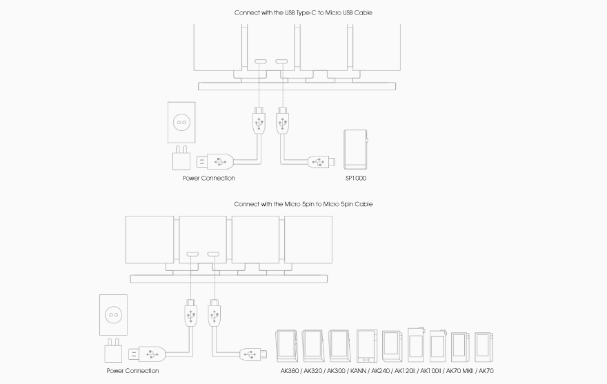 只需要使用我們提供的配件就能簡單地把 AK CD-RIPPER MKII 和 Astell&Kern; 播放器連接在一起。 *如使用額定電壓低於5V 2A的電源變壓器時,可能無法識別 AK CD-RIPPER MKⅡ。