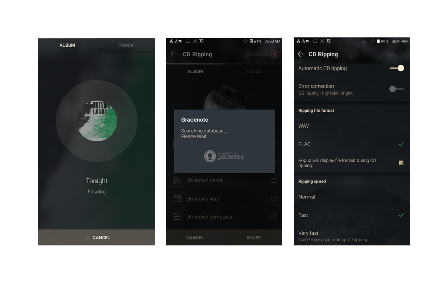 AK CD-RIPPER MKII 能簡單輕易地進行CD 讀碟。 只需預先於 Astell&Kern; 播放器設定讀碟選項,用家便可以簡單進行讀碟。 Astell&Kern;播放器與AK CD-RIPPERMKII接駁後(請先開啟播放器的WiFi並連接到互聯網),就會連接到Gracenote的伺服器搜尋相關的音樂資訊和唱片資料,自動寫入音訊檔案內。如Gracenote並沒有相關資料用家亦可以手動輸入其資料,例如唱片名稱,歌手。 另外,用家可經設置選單中設定讀碟速度(正常 / 快 / 非常快)以及檔案格式(WAV / FLAC)。