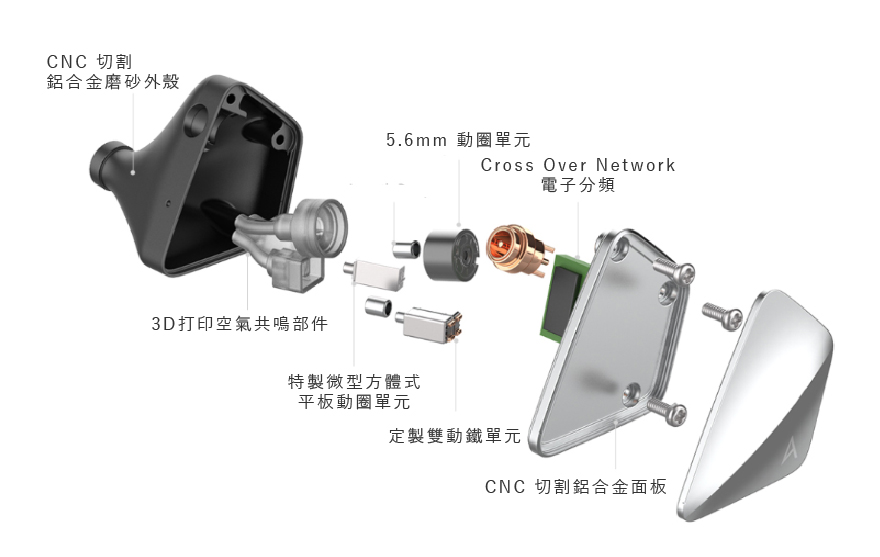 除特製平板動圈單元外,ZERO1亦同時採用一枚5.6mm動圈單元,以及兩枚定製動鐵單元作調音。為令耳機內的各個單元達至完美平衡,Astell&Kern於透徹研究並了解各單元的參數特性後,於ZERO1內採用Cross Over Network作電子分頻處理,以發揮不同單元之間最理想的頻率。此外,Astell&Kern亦於耳機中採用經精確3D打印技術製成的空氣共鳴部件,透過控制並計算筐體內空氣流動作調音,確保單元於筐體中被穩妥固定的同時,亦可消除不理想的諧震所帶來的影響,確保ZERO1音色得以被完美發揮。