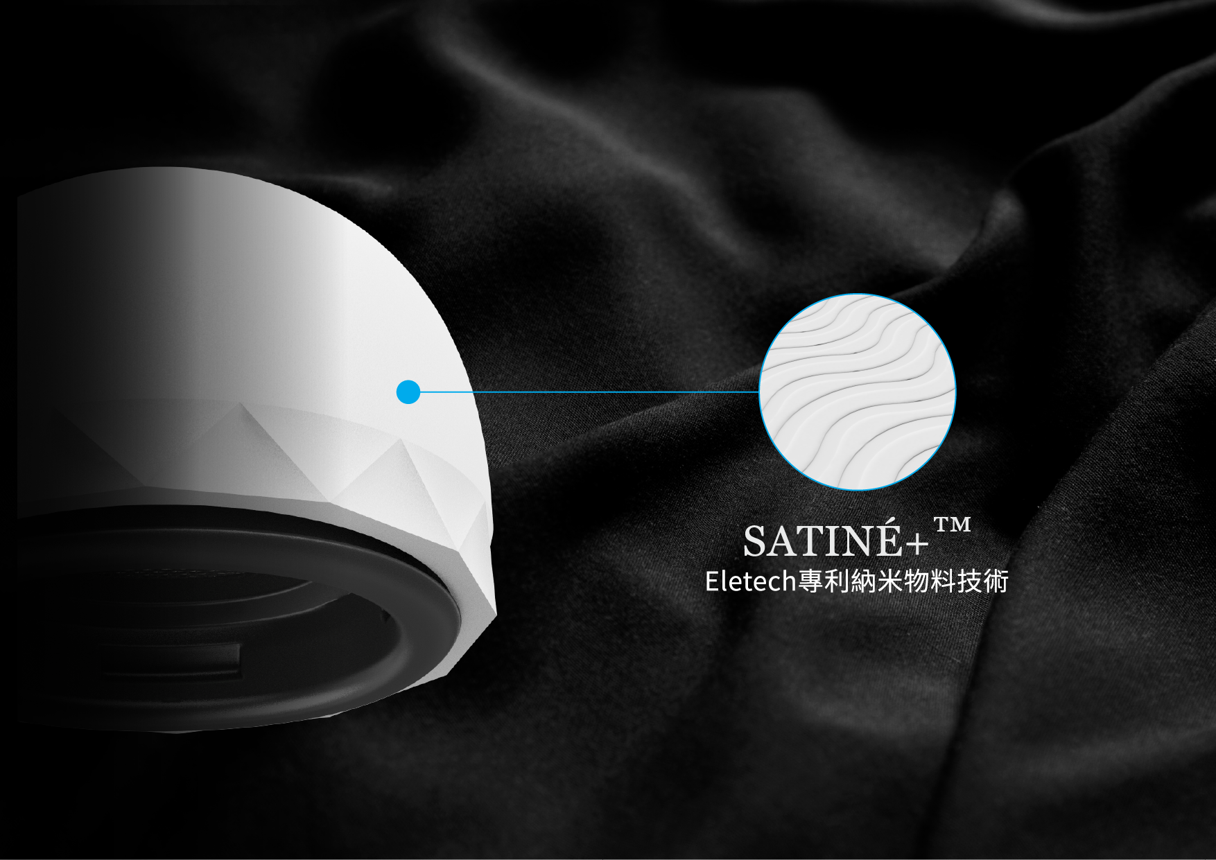「SATINÉ+™」是Eletech專有的創新材料技術,采用通過奈米波浪紋結構,讓耳帽表層更均勻地分散耳壓分佈,從而減低了與皮膚與耳膠表層的磨擦,有助聲音更直接地傳導至耳道內。而奈米光滑塗層夠提升整體觸感和舒適度,擁有更佳的佩戴體驗。