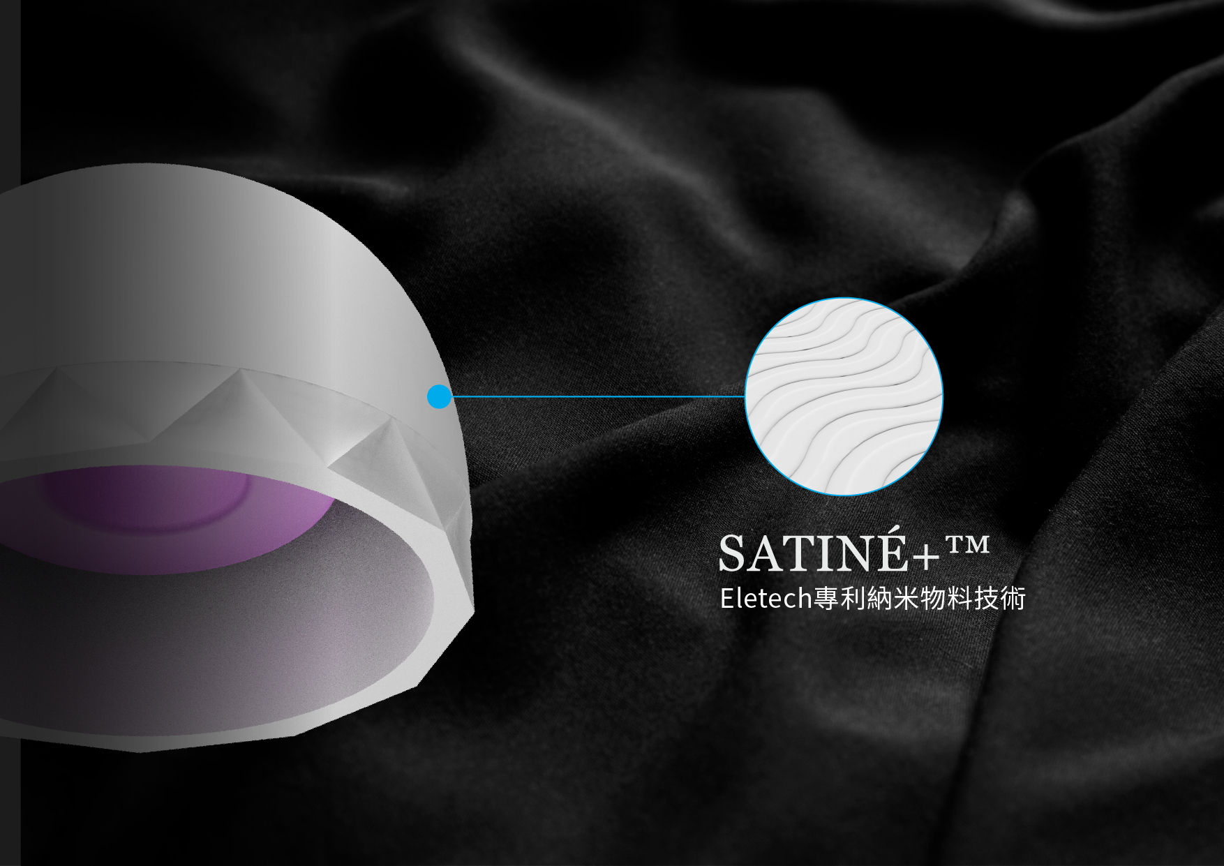 「SATINÉ+™」是Eletech專有的創新材料技術,采用通過奈米波浪紋結構,讓耳帽表層更均勻地分散耳壓分佈,從而減低了與皮膚與耳膠表層的磨擦,有助聲音更直接地傳導至耳道內。而奈米光滑塗層夠提升整體觸感和舒適度,擁有更佳的佩戴體驗。