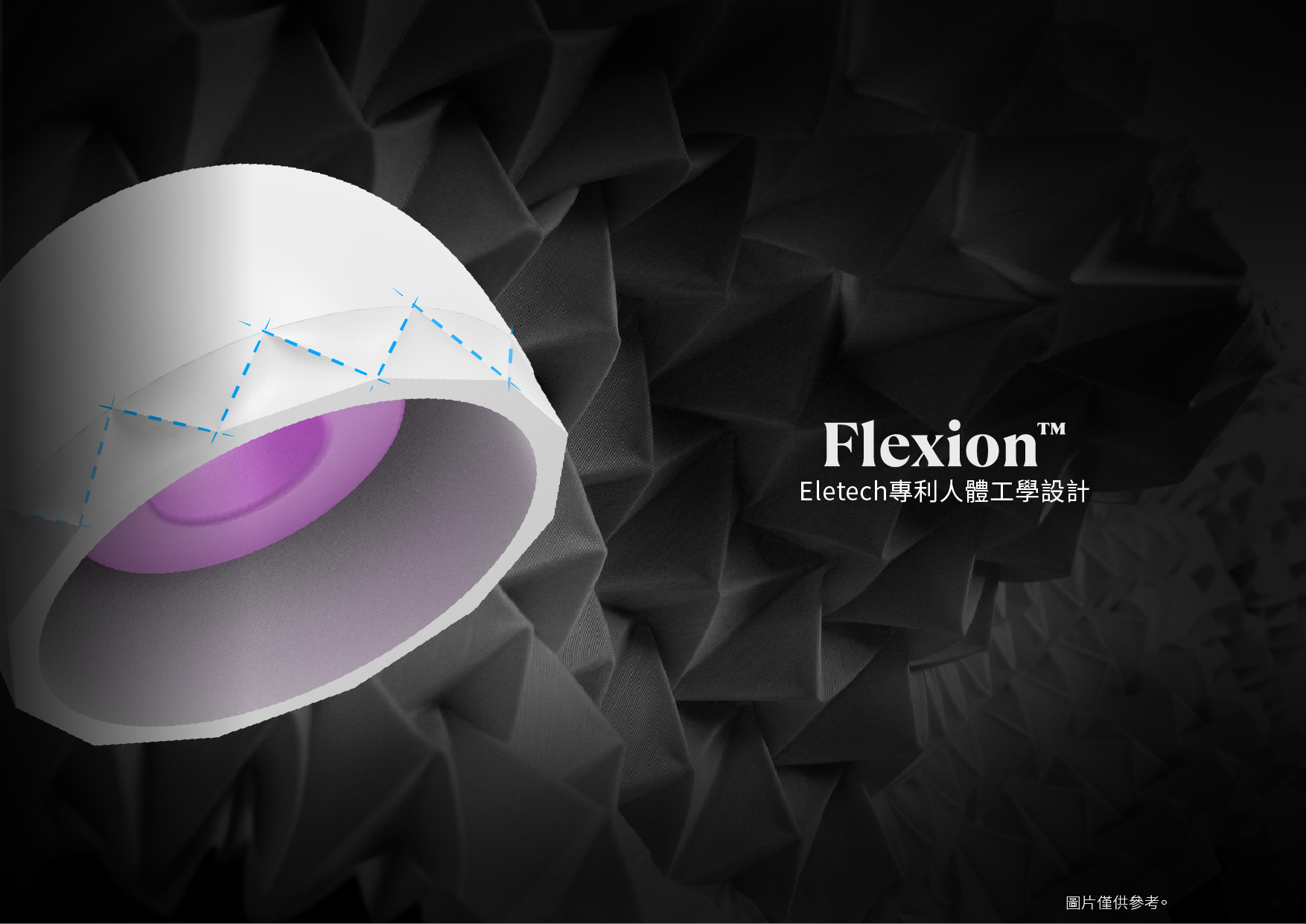 「Flexion™」的耳道形狀記憶矽膠材質讓耳膠具有彎曲並適應耳道形狀和吸收諧振的特性,使其能在遭受形變後迅速恢復原態。即使與人體皮膚接觸,也不會造成任何不適,從而提供一種自然且舒適的佩戴體驗,以達到最優的噪音隔離效果,同時避免傘帽塌陷變形而導致低頻量感損失的問題。