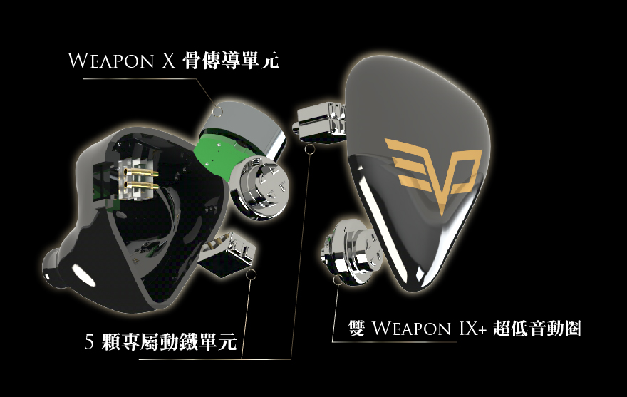 EVO,即是Evolution(進化)的意思,要創造出新世代的産品就要經過大膽的嘗試,Legend EVO採用全新的三混合式八單元組合,以雙重聲音傳導結構(Dual Conduction Architecture),將空氣傳導及骨傳導的優勢充分發揮,得到兩全其美的聲學效能,展現出Empire Ears創新及卓越技術的典範。 空氣傳導的部分經由兩顆9mm Weapon IX+ 超低音動圈以及五顆專屬動鐵單元負責5Hz-20kHz的聲音頻段;而最新研發的Weapon X 骨傳導單元,則負責5Hz-35kHz的頻段。通過兩種聲音傳導方法的協同作用,帶來更加寬廣的音場,將錄音中應有的豐富細節重新呈現。