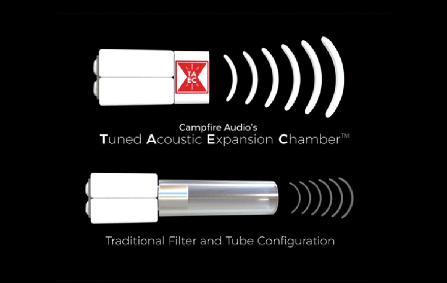 Tuned Acoustic Expansion Chamber, T.A.E.C.TM是Campfire Audio應用於動鐵單元的專利技術。品牌認為傳統動鐵的單元管道,會使到聲音壓縮,在高頻部分尤其嚴重。Campfire 於是引用樂器的共鳴箱原理,在去除了管道的動鐵單元上,加上3D打印的T.A.E.C.TM共嗚部件,使到高音更為通透細緻,帶有自然的空氣質感。 由於製作極為複雜困難,一般難以普及在中階及初燒的耳機上。於品牌不斷努力研究下,終於將T.A.E.C.TM 的技術,結合最新3D打印聲學迷宮技術,將T.A.E.C.TM直接打印在迷宮之中,令到技術得以推廣,同時亦都可減少因為多樣調音部件同時工作所產生的共振問題,令到聲音可以達到更高密度。