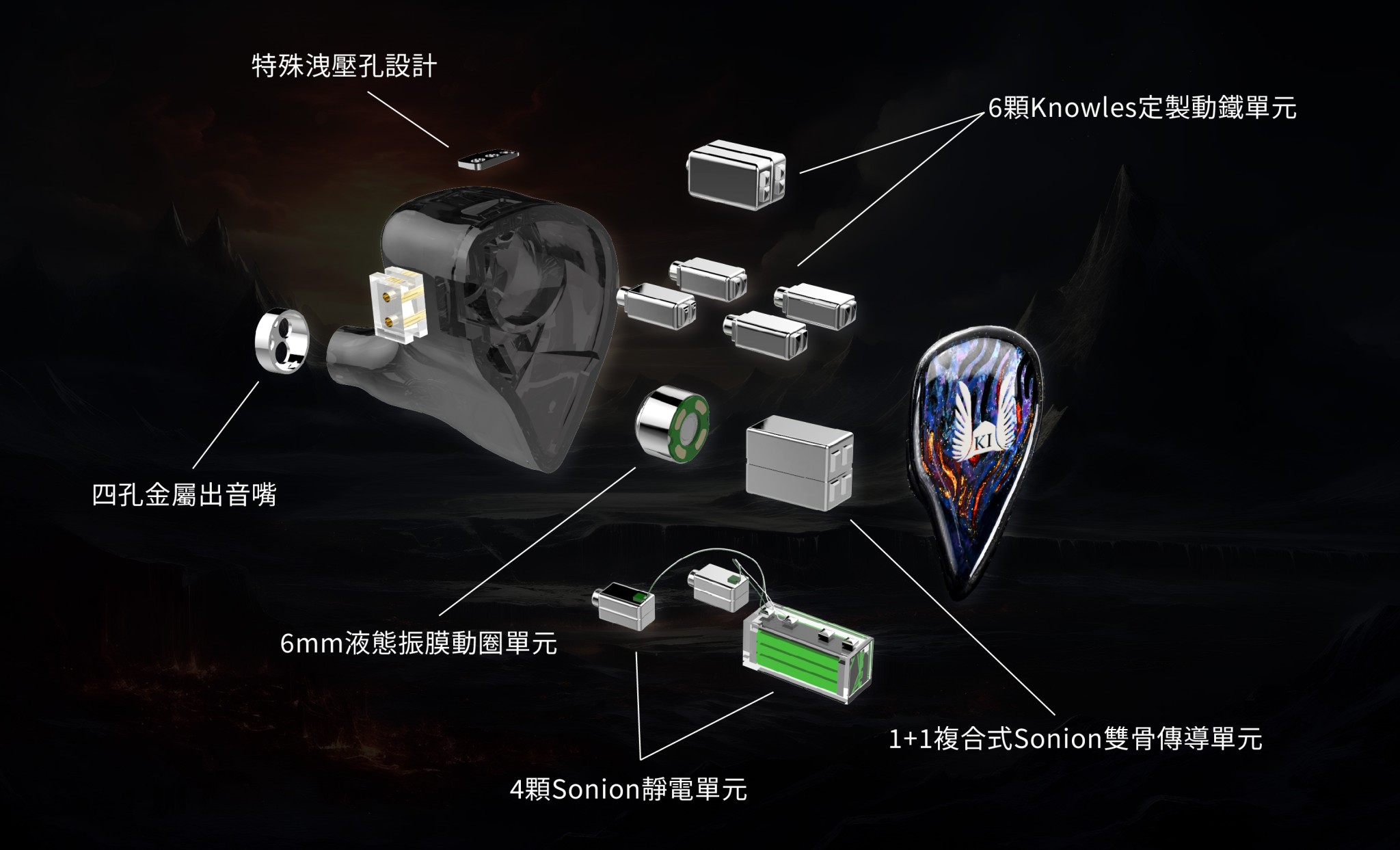 Hela在技術與結構設計上並非單純的「堆疊單元數目」,基於過往混合單元耳機型號的各項參數作為指標,建構出「1642」的四混合十三單元陣列。在低頻部分,採用Kinera專屬設計的6mm液態振膜動圈單元,以確保低頻的深沉與飽滿。於中頻至中高頻,則精心配置了「4+2」的Knowles定製動鐵單元組合,提升了中頻至高頻的自然度和順暢度;此外,再搭配四顆負責超高頻區段的Sonion靜電單元作為聲音輸出的核心,配合金屬出音嘴設計,能夠更好地控制聲波的傳播,實現了更廣泛的高頻延伸,還大幅提升了細節的表現力,同時保持了恰當的明亮度與柔和度。