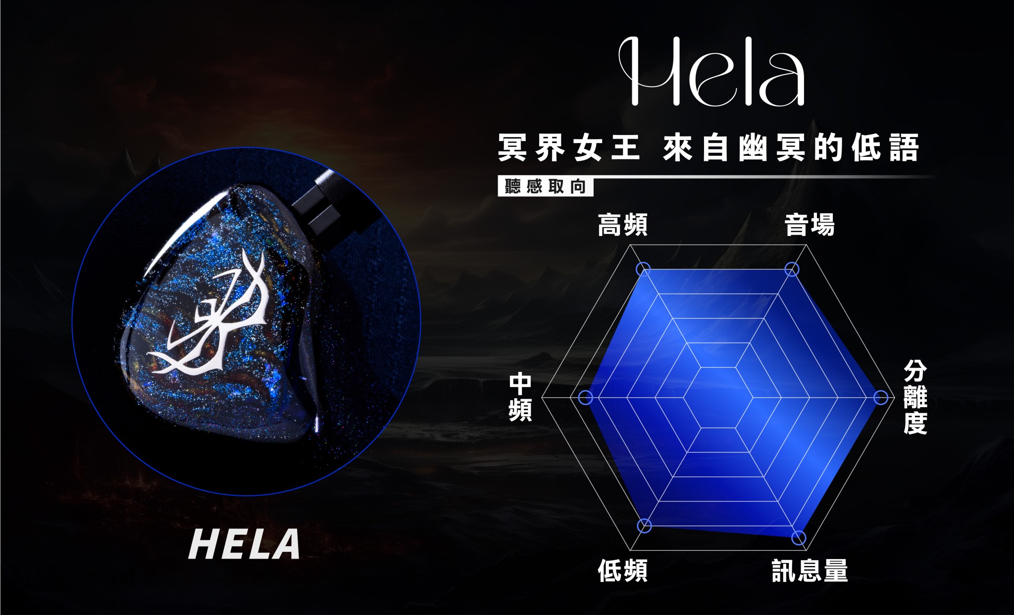 Hela的調音理念特別強調氛圍感、利落感、起伏感、包圍感等四大感觀,同時具備極高的還原度和出色的細節表現力,同時有著均衡、耐聽的健康聽感。歸功於Sonion骨傳導單元的輔助下,令它能夠在強大的聲音質素下保留線性連貫的自然銜接。Hela在低頻部分展現出卓越的彈性和深沉的下潛力,在高強度打擊之下,低音保持柔韌、敏捷,鼓點實在,有足夠的延伸讓鼓皮的震動和迴響更具質感;同時又能在充滿氣氛的爵士樂中,保持良好的起伏感,來讓低音托底顯得穩定和分明,層次與擴散感也更加出色。是一種很有躍動感與綿密度的低音表現。