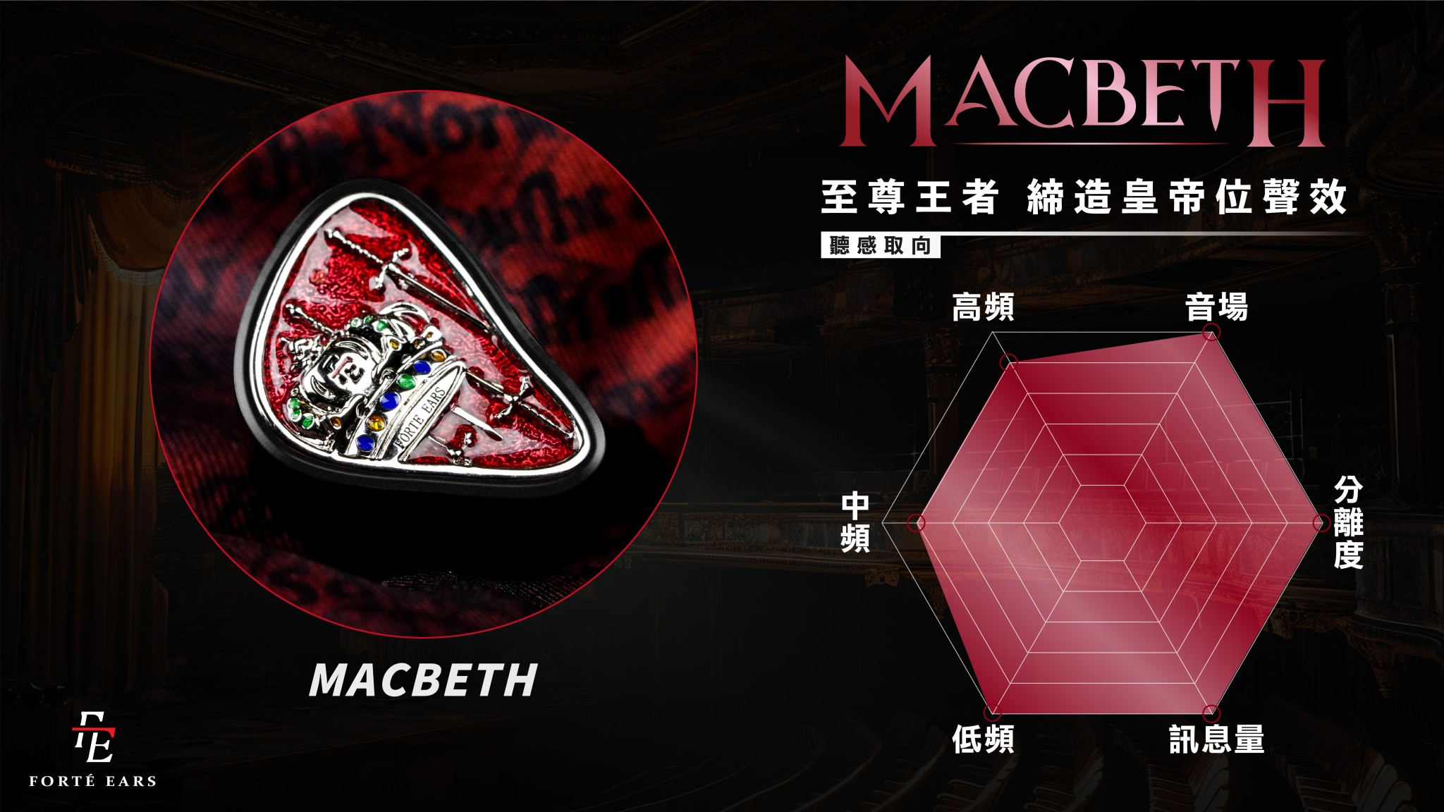 Macbeth擁有極其充沛的訊息量和極致的聲音揭示力,其音場表現和瞬態反應超越了一般的入耳式耳機。它的高頻泛音細膩且整體通透度優異。高頻部分明亮滑順,擁有足夠的光澤感而不刺耳;中頻人聲質地溫潤,細節豐富而不黏膩;低頻則勁力深沉,不渾濁且不過度氾濫,帶來清爽的節奏感。