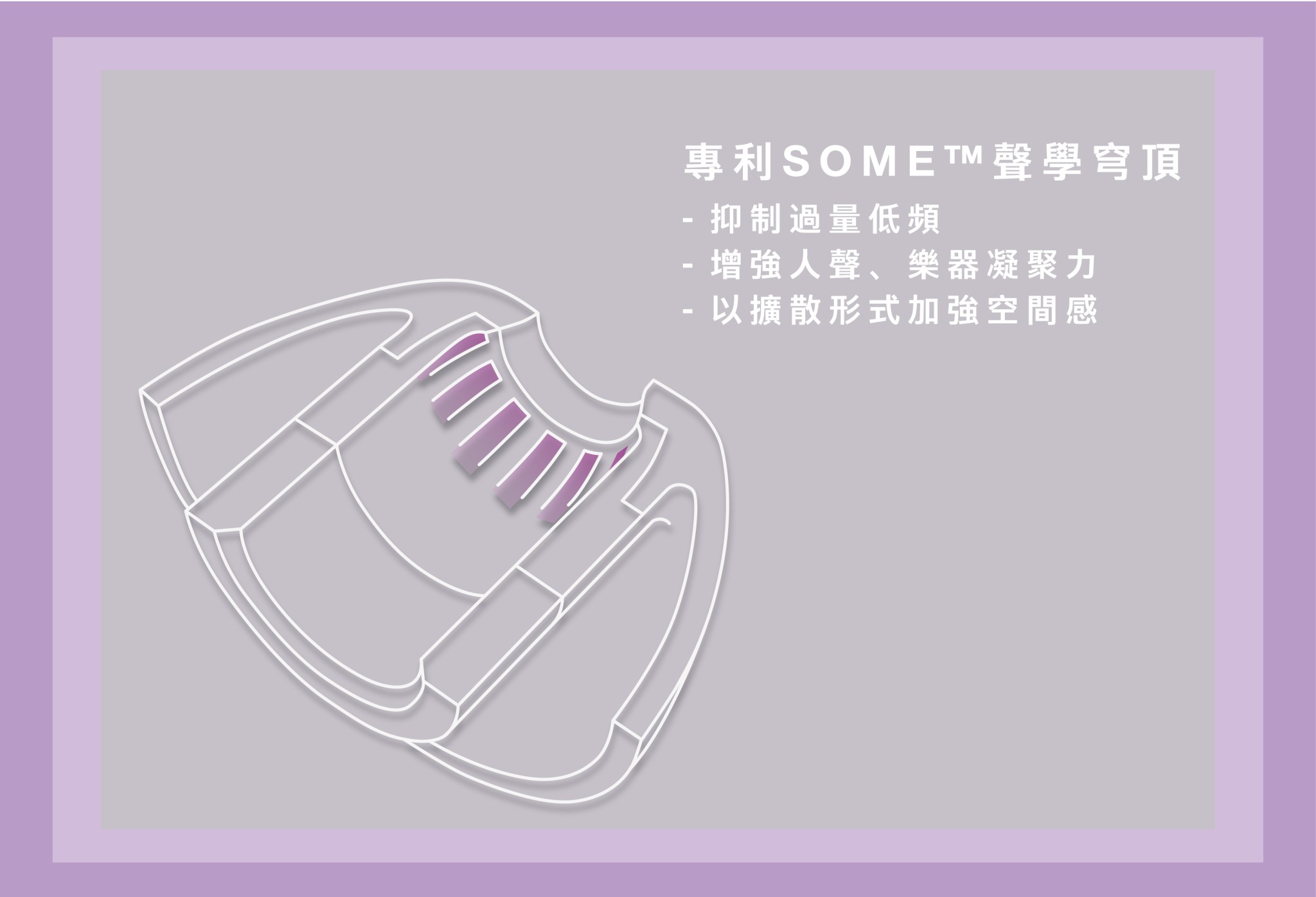 品牌專利的 SOME™聲學穹頂,有效增強人聲、樂器的凝聚力,同時利用窄小的出音嘴設計,令來自airpod pro/pro 2的音訊,可以透過繞射的方式傳遞,加強整體的立體感!