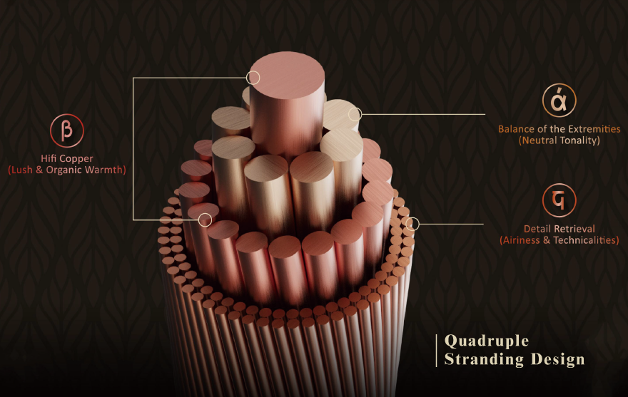 導體依照所對應的頻段製成四種不同尺寸,按Eletech Quadruple Stranding Design根據不同頻段的傳輸形式所排序絞合而成,以純銅為基石,幻化出全面而豐富的聲音特質