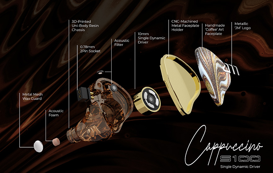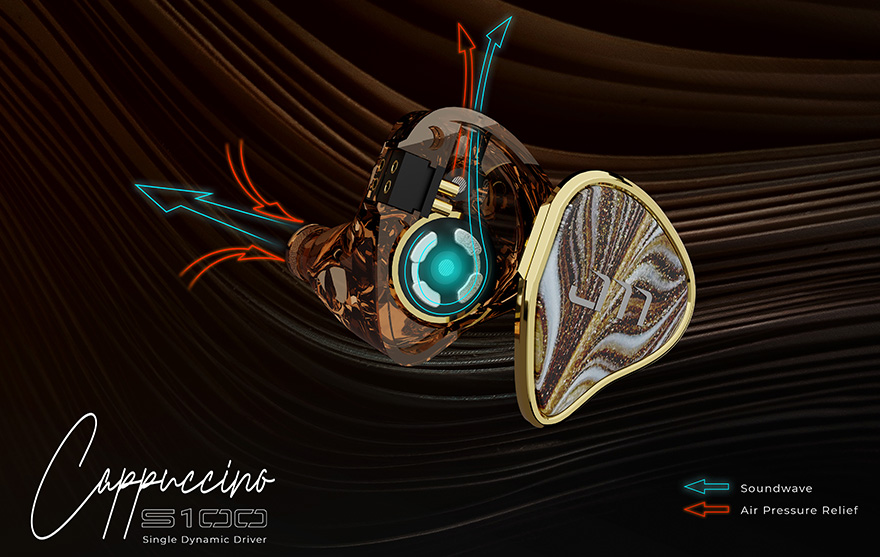S100 Cappuccino 採用 10mm 單動圈設計,其隔膜由液晶聚合物製成。 超薄 LCP 薄膜在熱壓下壓縮成型,賦予振膜形狀,可再現具有逼真氛圍和情感的聲音,而且令保真度及分析力提升。聚合物的剛性提高了驅動器的堅固性,其超薄的厚度降低了振膜的整體重量並提高了發聲效率。