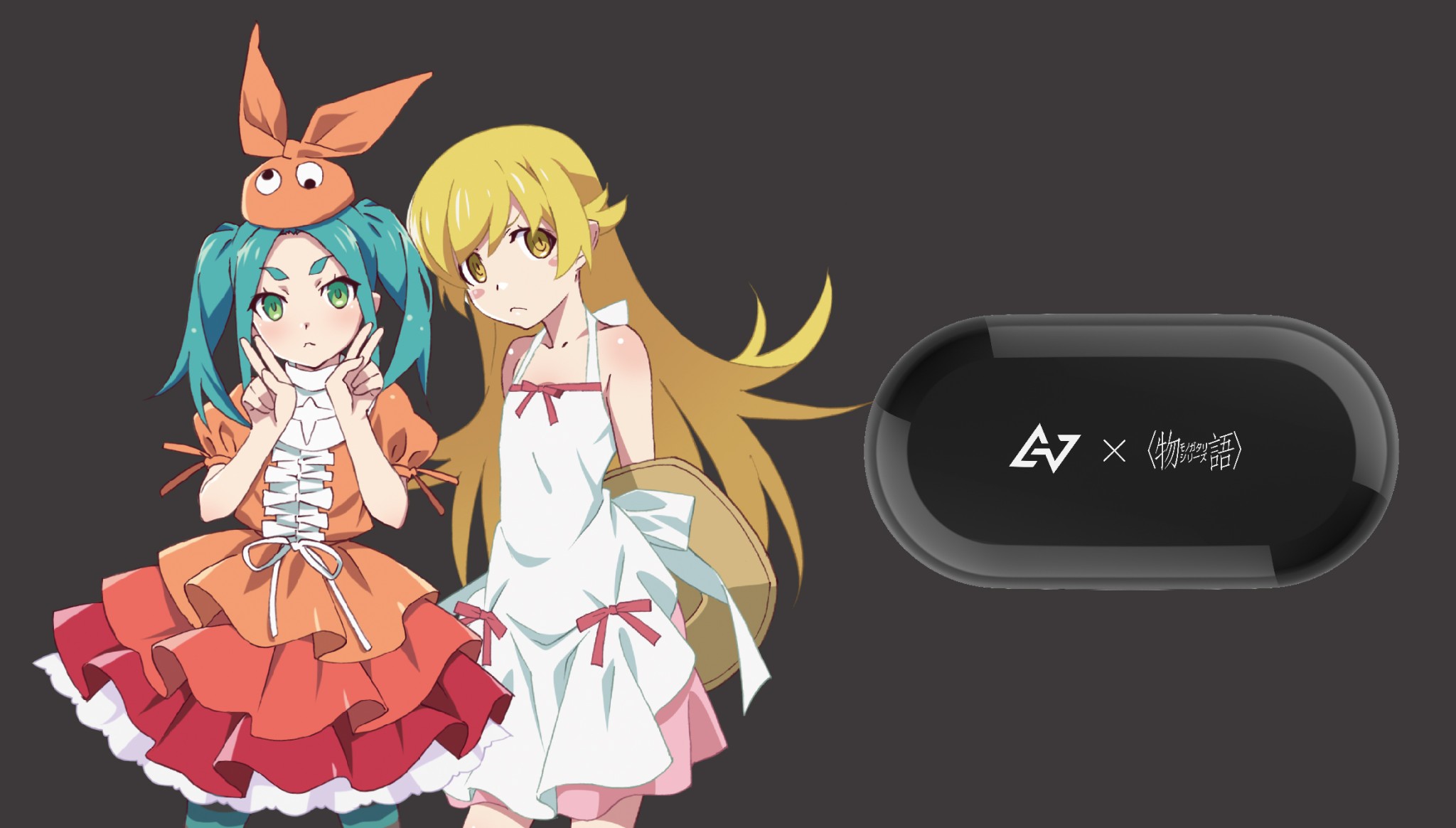 耳機本身飾有“怪”和“蕩”字符,象徵“物語系列”。充電盒和耳機的配色方案靈感來自物語系列中出現的私立直江津高中的製服。