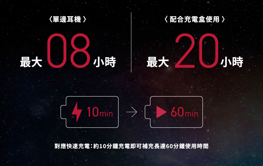 耳機本體單獨使用可達最長8小時*,如果搭配充電盒使用,最長更可達20小時的長時間播放。 此外,TE-ZX1 還支援快速充電功能,只需充電10分鐘即可使用最長60分鐘,無需擔心電池問題。