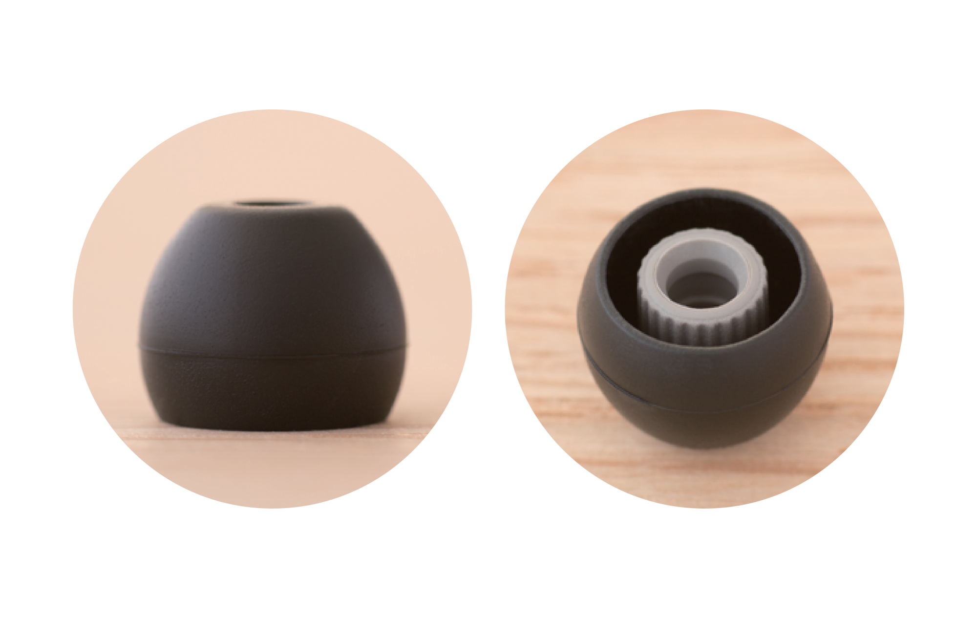 E Type 耳膠每一粒都使用了兩款不同的矽膠物料: 耳機導管位置使用了較硬的、經凹槽加工的矽膠, 而外部則使用了較軟身的矽膠, 令配戴更舒適、隔音效果更理想。