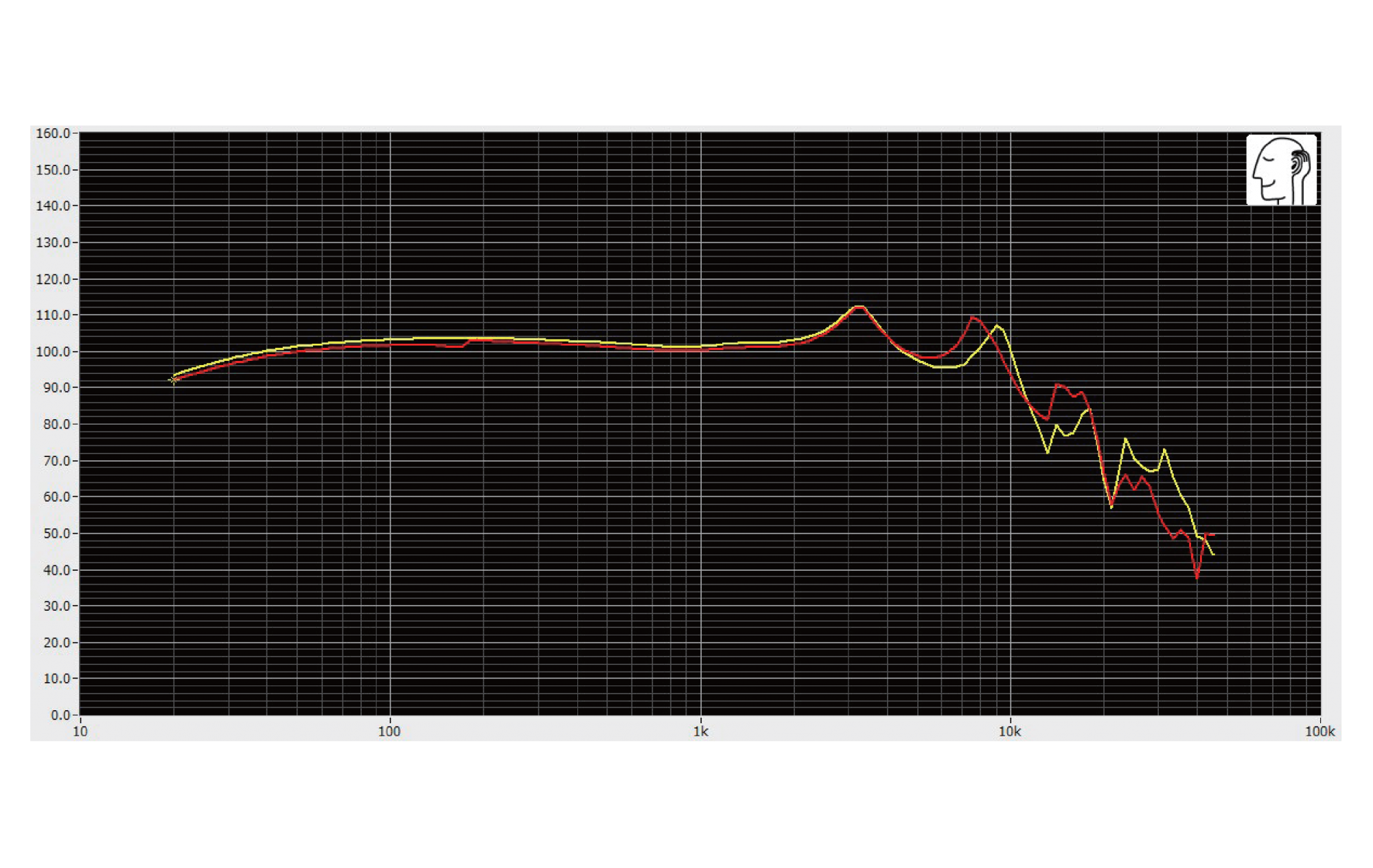當耳機更靠近耳膜 (黃色曲線), 一方面低頻的音壓會增加, 而高頻的刺耳感也會被緩和, 令聲音效果更為理想。