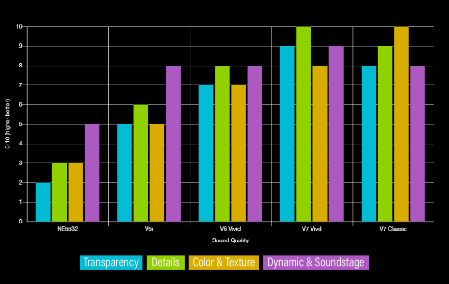 另一方面,V7 Classic 可以比作增添美食風味的完美調料。它具有完全重新設計的輸出級,解決了其前身 V6 Classic 的限制。V7 Classic 現在達到了與 V7 Vivid 相同的超低噪音水平,同時保留了 V6 Classic 愛好者所喜愛的親密人聲和閃亮高音。此外,它還在低頻的動態和準確性方面有所改進,在享受和嚴肅性之間取得了理想的平衡。