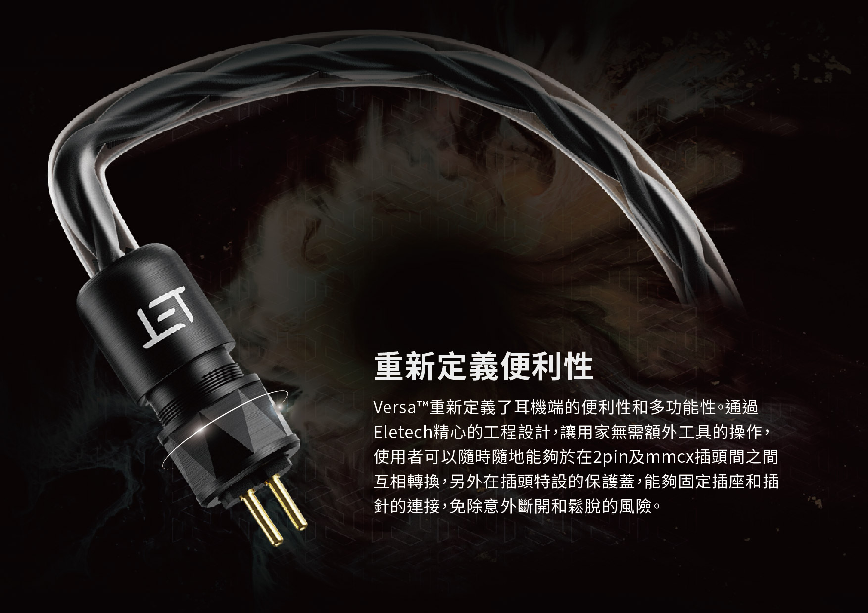 Versa™重新定義了耳機端的便利性和多功能性。通過Eletech精心的工程設計,讓用家無需額外工具的操作,使用者可以隨時隨地能夠於在2pin、pe、mmcx插頭之間互相轉換,另外在插頭特設的保護蓋,能夠固定插座和插針的連接,免除意外斷開和鬆脫的風險。