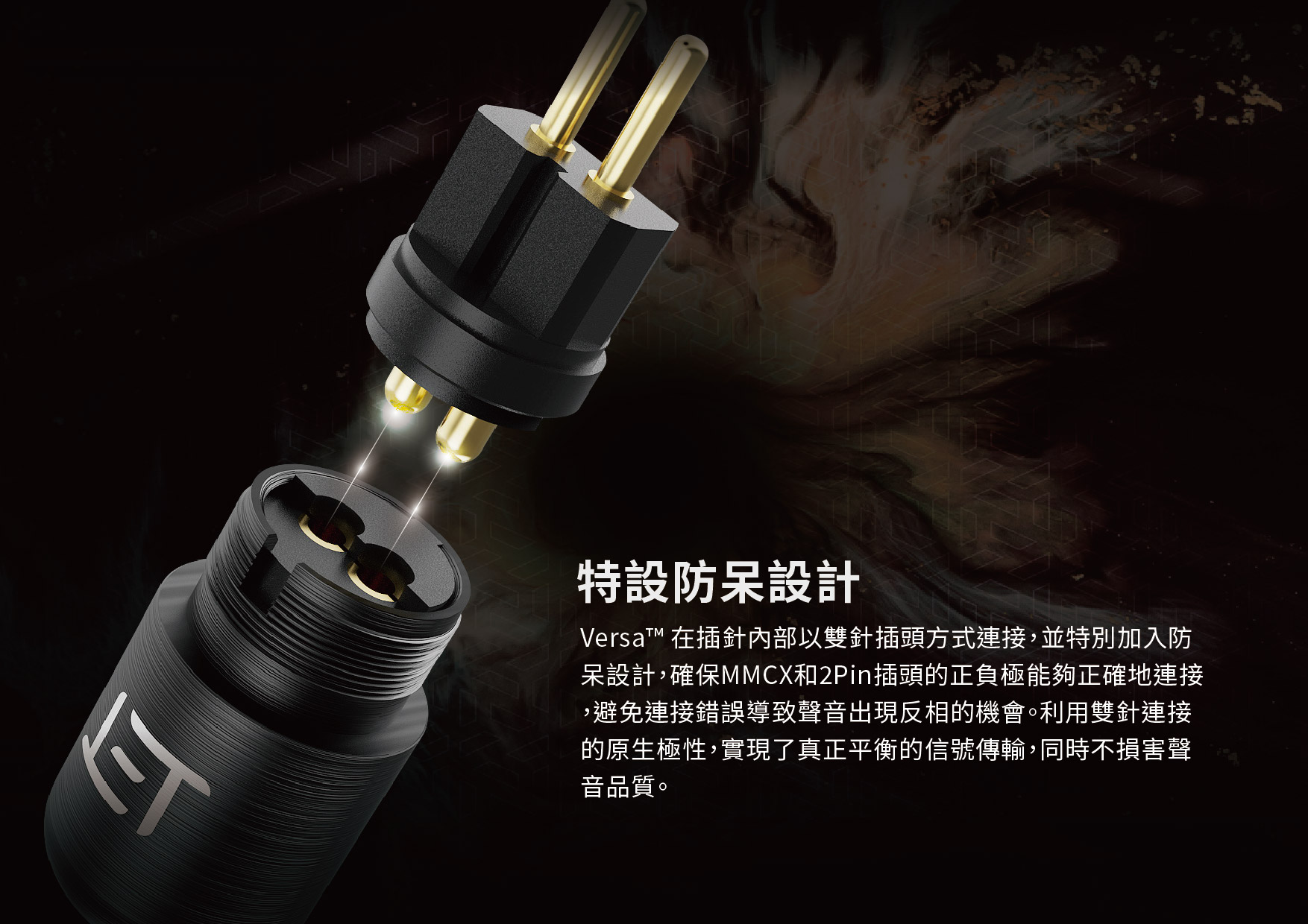 Versa™ 在插針內部以雙針插頭方式連接,並特別加入防呆設計,確保MMCX、2Pin、PE插頭的正負極能夠正確地連接,避免連接錯誤導致聲音出現反相的機會。利用雙針連接的原生極性,實現了真正平衡的信號傳輸,同時不損害聲音品質。