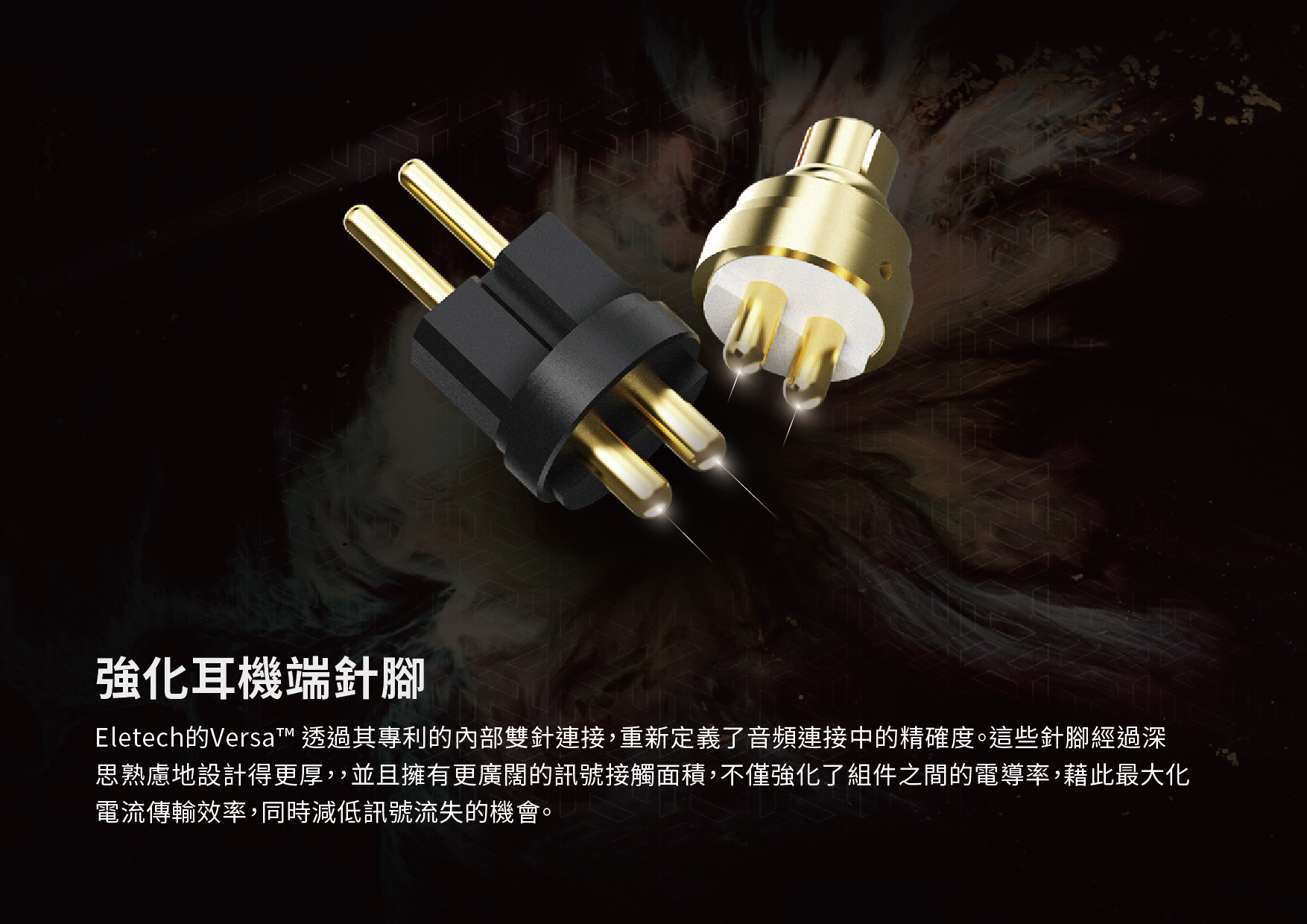 Eletech的Versa™ 透過其專利的內部雙針連接,重新定義了音頻連接中的精確度。這些針腳經過深思熟慮地設計得更厚,並且擁有更廣闊的訊號接觸面積,不僅強化了組件之間的電導率,藉此最大化電流傳輸效率,同時減低訊號流失的機會。