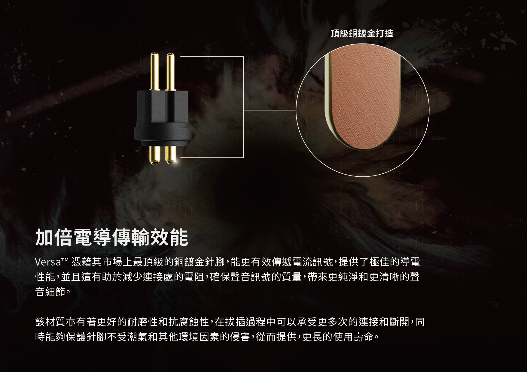 Versa™ 憑藉其市場上最頂級的銅鍍金針腳,能更有效傳遞電流訊號,提供了極佳的導電性能,並且這有助於減少連接處的電阻,確保聲音訊號的質量,帶來更純淨和更清晰的聲音細節。