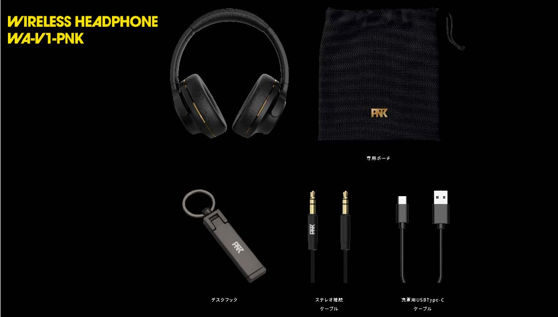 PNK版本隨附限量配件,具功能與的設計,用於有線連接的3.5mm立體聲迷你插頭線也是該產品的特殊規格,是與Pierre Nakano先生在音質和設計方面經過深思熟慮後選擇的。採用防纏結尼龍電纜,插頭上印有「PNK」標誌。 此外,根據Pierre Nakano的想法,還包括一個可折疊的耳機桌鉤。即使在旅途中或在辦公室的有限空間內,您也可以舒適地使用它,而無需擔心耳機放在哪裡。